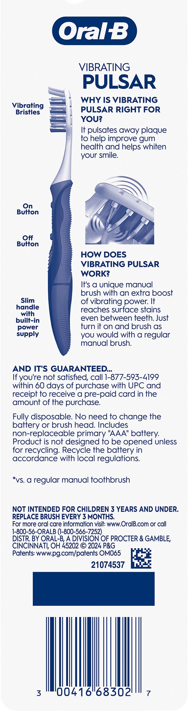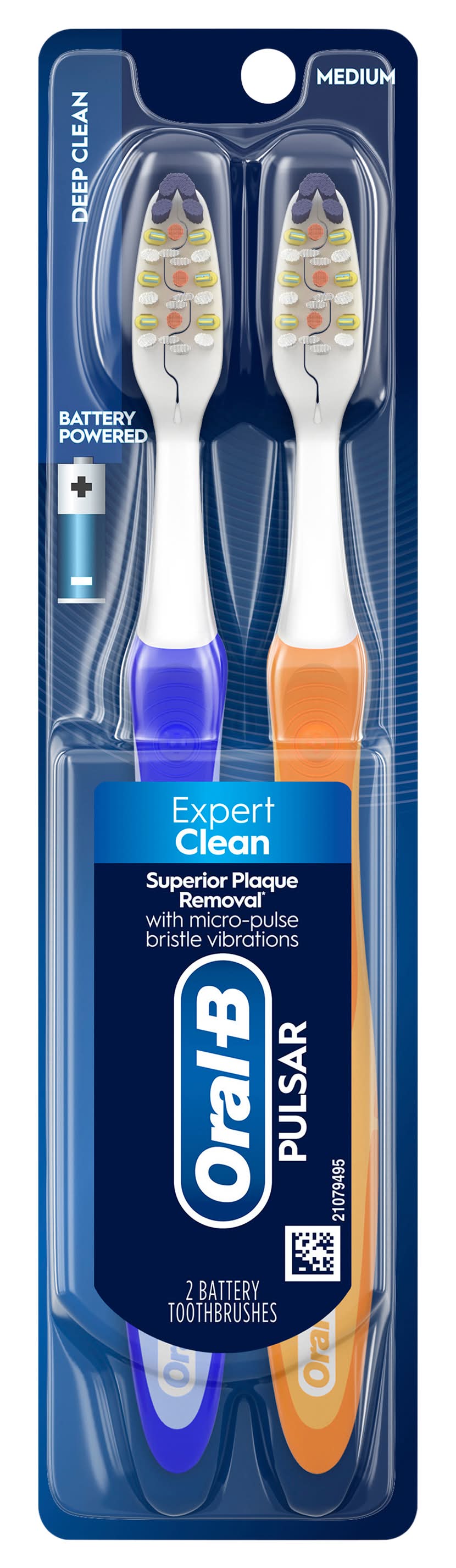 The Oral-B Expert Clean Pulsar toothbrush is battery operated and provides superior plaque removal with micro-pulse bristle vibrations versus a regular manual toothbrush. The vibrating bristles on this toothbrush help break up plaque between teeth. The split head design moderates the amount of pressure applied to your teeth and gums. Power tip bristles on the toothbrush head reach deeper and provide a precision clean behind teeth. Oral-B is the #1 Toothbrush Brand Used by Dentists Worldwide. This pack of Oral-B toothbrushes include different colors of toothbrushes for households with multiple people or stocking up. • Size: M • Oral-B, Cincinnati, OH, 45202 • Packaging: Reusable