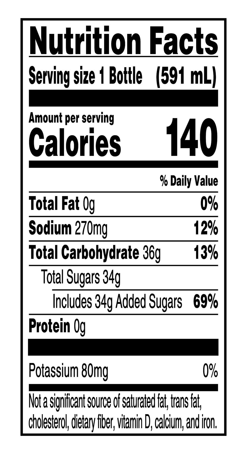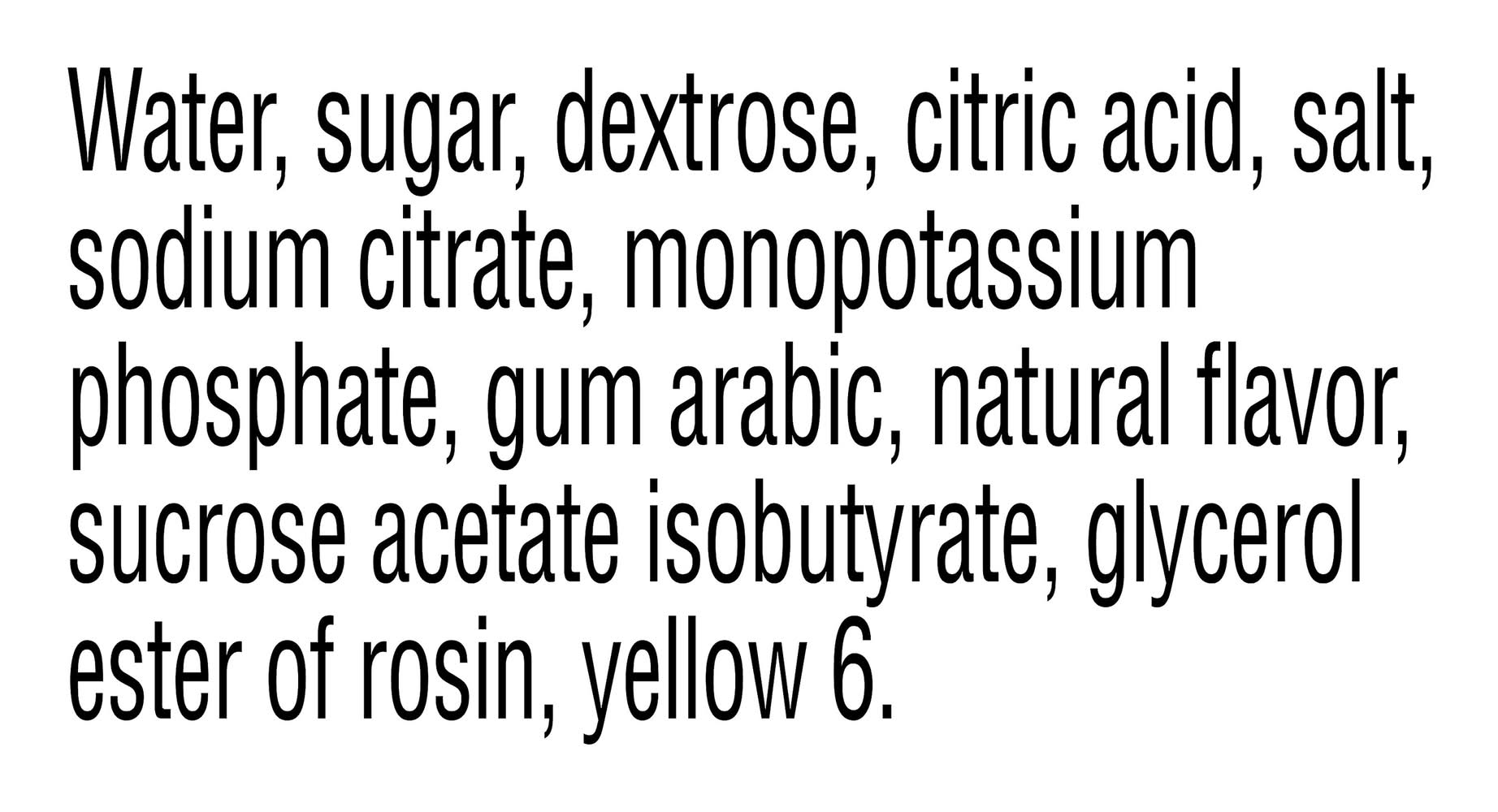 Ingredients: Water, Sugar, Dextrose, Citric Acid, Salt, Sodium Citrate, Monopotassium Phosphate, Gum Arabic, Natural Flavor, Sucrose Acetate Isobutyrate, Glycerol Ester of Rosin, Yellow 6