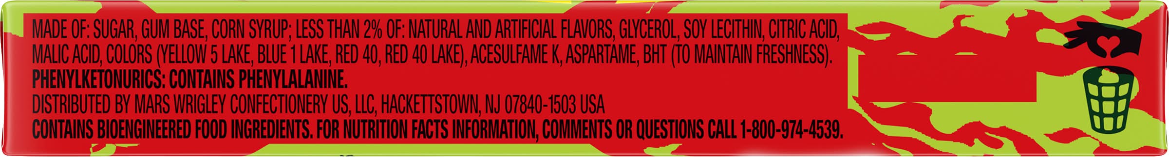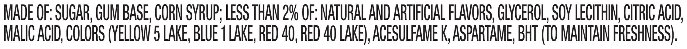Ingredients: Sugar, Gum Base, Corn Syrup, Less than 2% of: Natural and Artificial Flavors, Glycerol, Soy Lecithin, Citric Acid, Malic Acid, Colors (Yellow 5 Lake, Blue 1 Lake, Red 40, Red 40 Lake), Acesulfame K, Aspartame, BHT (to Maintain Freshness) Contains: Soybeans