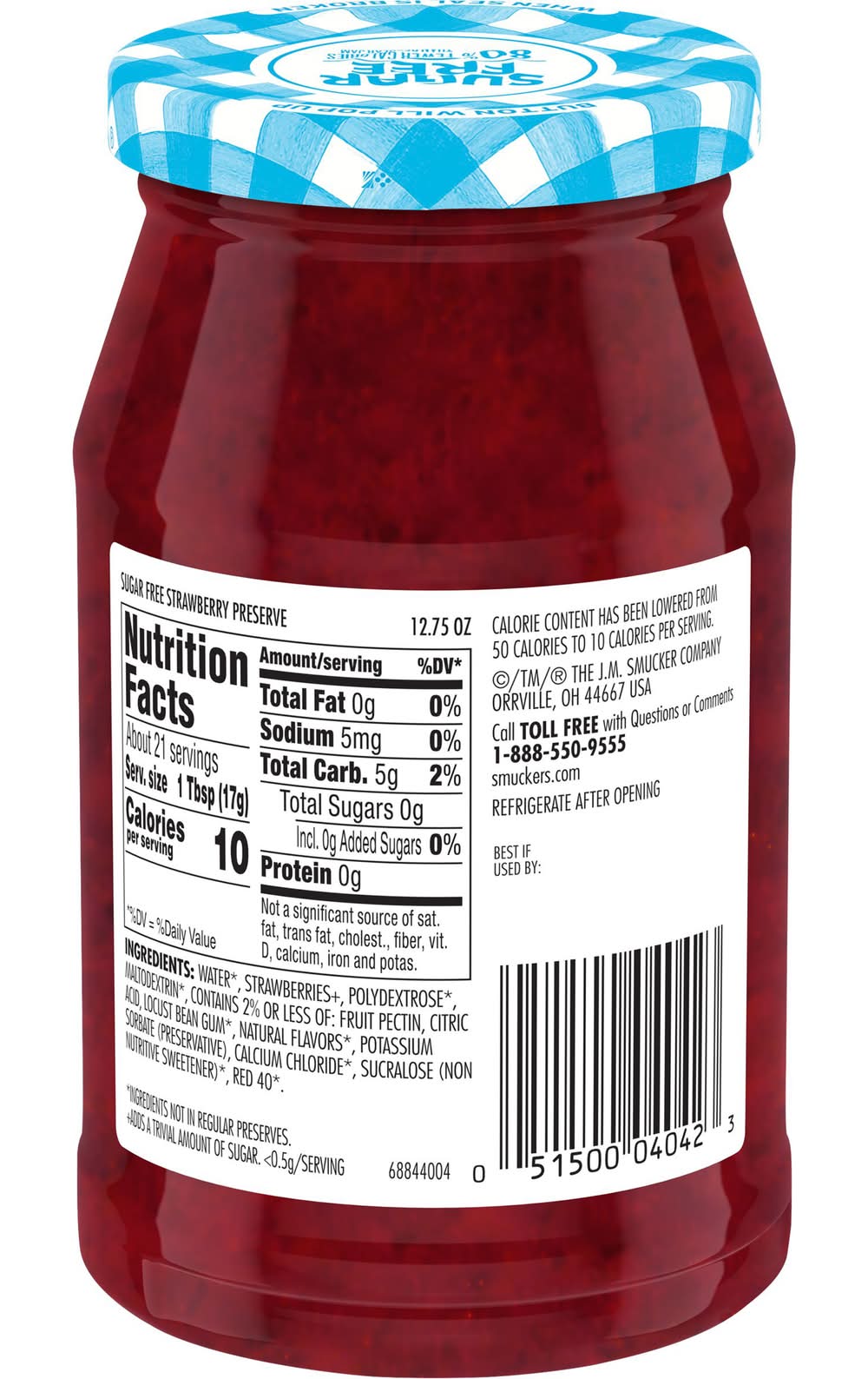 Ingredients: Water*, Strawberries+, Polydextrose*, Maltodextrin*, Contains 2% Or Less Of: Fruit Pectin, Citric Acid, Locust Bean Gum*, Natural Flavors*, Potassium Sorbate (Preservative), Calcium Chloride*, Sucralose (Non Nutritive Sweetener)*, Red 40*. *Ingredients Not In Regular Preserves. +adds A Trivial Amount Of Sugar. 0.5g/Serving