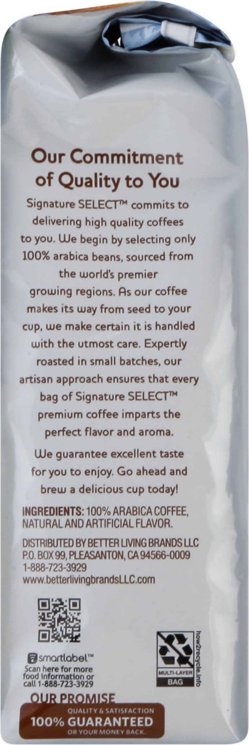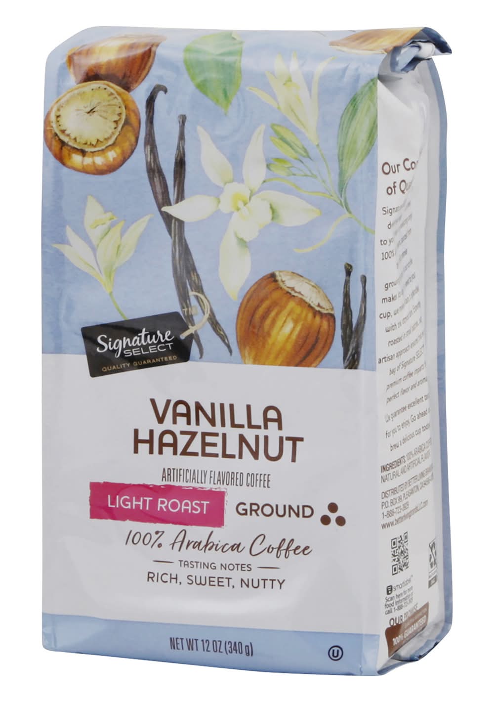 Artificially flavored coffee. Tasting Notes: Rich, sweety, nutty. Vanilla and hazelnut flavoring combine in balanced harmony to create an intensely rich cup. This mild-bodied coffee brings luscious, nutty overtones and the delicate sweetness of vanilla. It is an indulgent treat that is great for any occasion or gathering! Our Commitment of Quality to You: Signature Select commits to delivering high quality coffees to you. We begin by selecting only 100% arabica beans, sourced from the world's premier growing regions. As our coffee makes its way from seed to your cup, we make certain it is handled with the utmost care. Expertly roasted in small batches, our artisan approach ensures that every bag of Signature Select premium coffee imparts the perfect flavor and aroma. We guarantee excellent taste for you to enjoy. Go ahead and brew a delicious cup today! Our Promise: Quality & satisfaction 100% guaranteed or your money back. www.betterlivingbrandsLLC.com. how2recycle.info. SmartLabel: Scan for more food information or call 1-888-723-3929. • Better Living Brands LLC, Pleasanton, CA, 94566-0009, Ph: 888-723-3929 • Packaging: Reusable