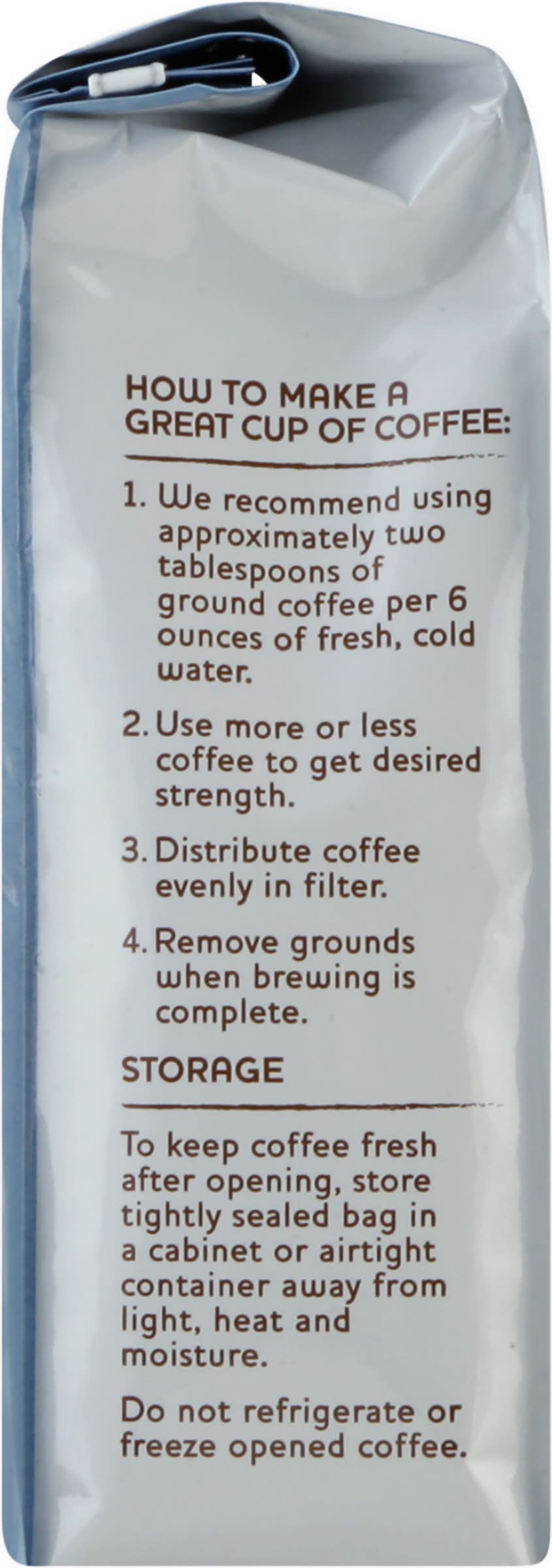 Directions for use: How to Make a Great Cup of Coffee: 1. We recommend using approximately two tablespoons of ground coffee per 6 ounces of fresh, cold water. 2. Use more or less coffee to get desired strength. 3. Distribute coffee evenly in filter. 4. Remove grounds when brewing is complete. Storage: To keep coffee fresh after opening, store tightly sealed bag in a cabinet or airtight container away from light, heat and moisture. Do not refrigerate or freeze opened coffee. Storage recommendation: Storage: To keep coffee fresh after opening, store tightly sealed bag in a cabinet or airtight container away from light, heat and moisture. Do not refrigerate or freeze opened coffee.