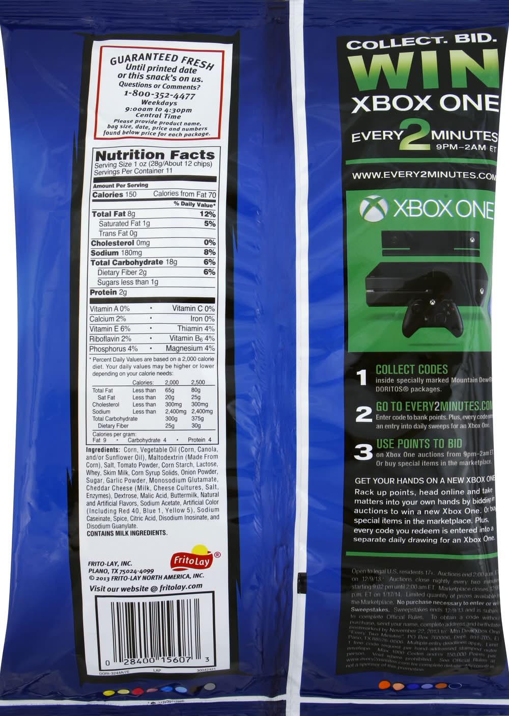 Ingredients: Corn, Vegetable Oil (Corn, Canola, Soybean, And/Or Sunflower Oil), And Less Than 2% Of Salt, Tomato Powder, Buttermilk, Lactose, Onion Powder, Sugar, Skim Milk, Cheddar Cheese (Milk, Cheese Cultures, Salt, Enzymes), Garlic Powder, Corn Maltodextrin, Potassium Salt, Monosodium Glutamate, Whey, Dextrose, Malic Acid, Natural And Artificial Flavors, Sodium Acetate, Artificial Color (Red 40, Blue 1, Yellow 5), Spices, Disodium Inosinate, Disodium Guanylate, And Citric Acid. CONTAINS MILK INGREDIENTS. Contains: CONTAINS MILK INGREDIENTS.