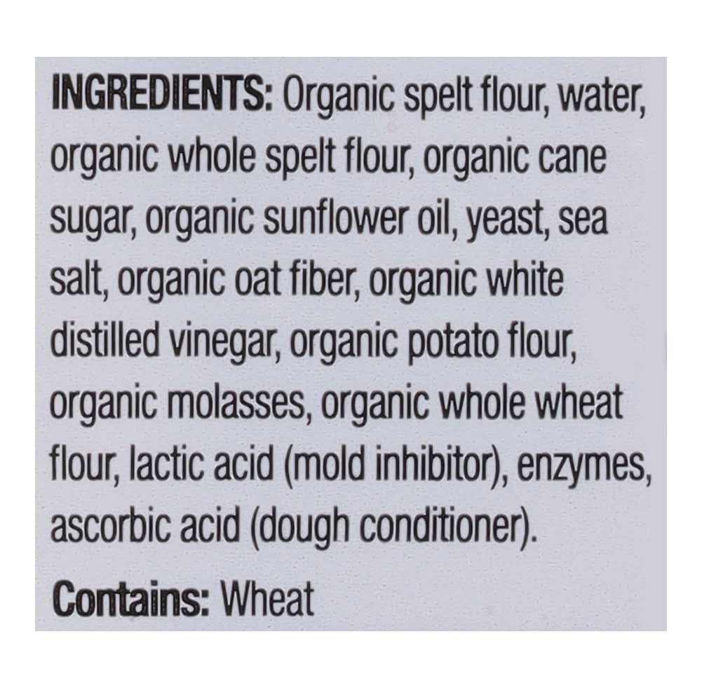 Organic Spelt Flour, Water, Organic Whole Spelt Flour, Organic Cane Sugar, Organic Sunflower Oil, Yeast, Sea Salt, Organic Oat Fiber, Organic White Distilled Vinegar, Organic Potato Flour, Organic Molasses, Organic Whole Wheat Flour, Lactic Acid (Mold Inhibitor), Enzymes, Ascorbic Acid (Dough Conditioner) Contains: Wheat, Oat Additives: None