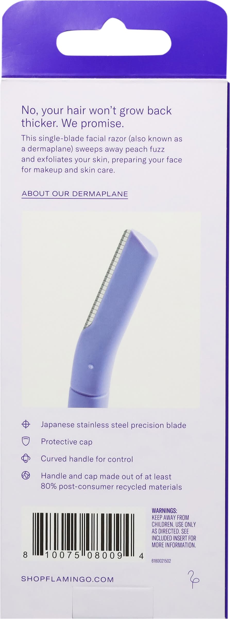 Meet step-zero of your skincare routine. This single-blade facial razor sweeps away peach fuzz and exfoliates skin, creating an even canvas for skincare and makeup application. A stainless steel Japanese precision blade removes fine hairs with ease and a protective guard keeps the blade covered when not in use. And rest assured, your facial hair will not grow back thicker after dermaplaning. EXFOLIATES SKIN AND REMOVES FINE HAIRS: Single-blade facial razor for women designed to sweep away peach fuzz and gently exfoliate skin STAINLESS STEEL JAPANESE PRECISION BLADE: High quality dermaplane blade precisely removes fine hairs CURVED HANDLE FOR CONTROL: Curved lilac razor handle made from at least 80% post consumer recycled plastic BLADE COVER: Protective guard keeps face razor covered, whether in your bathroom or your bag