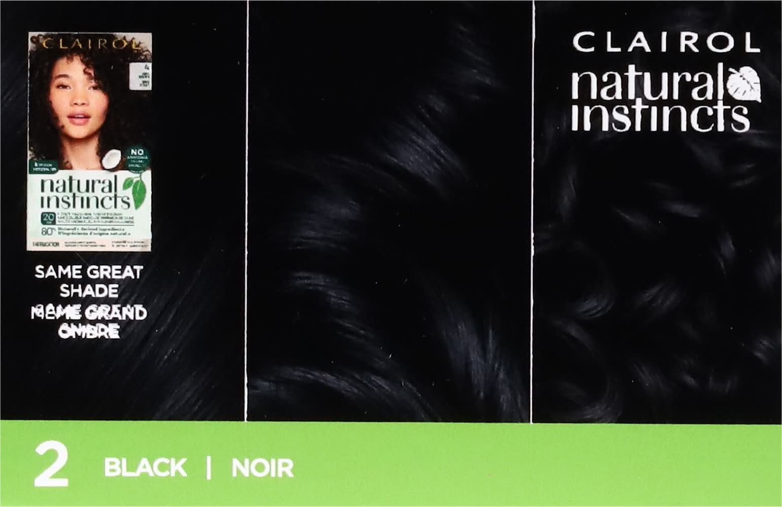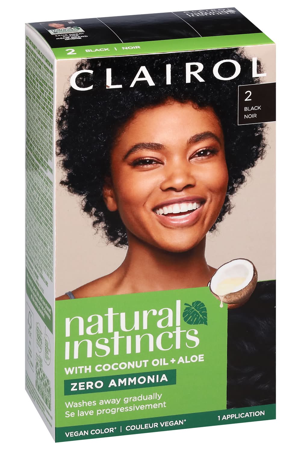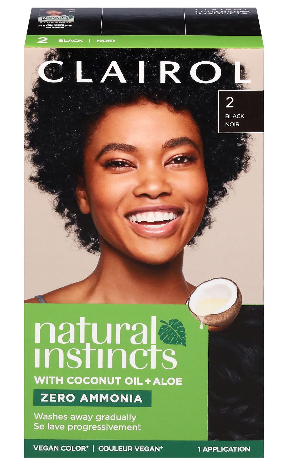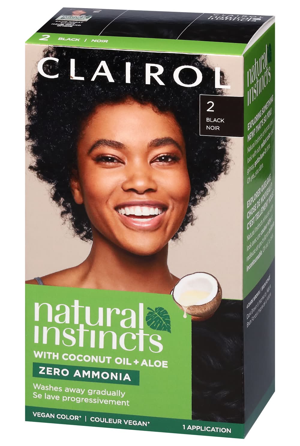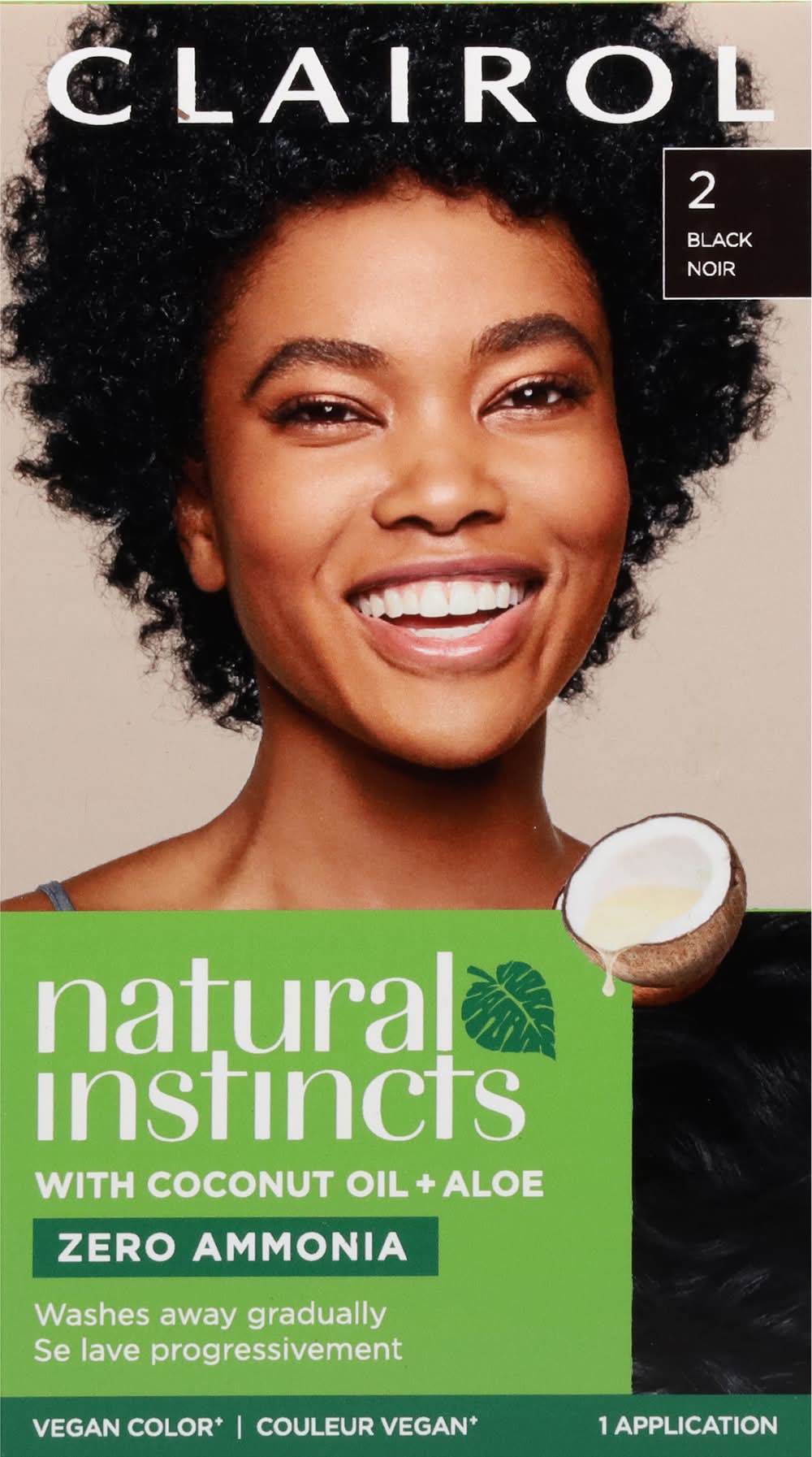 1. Color; 2. Activator; 3. Conditioner. Vegan Color (No animal derived ingredinets). With coconut oil + aloe. Zero ammonia. Washes away gradually. Dare to be brilliant. Get glossed! Feel more me with the hair color you want to be. It's a zero ammonia formula. With coconut oil + aloe. Conditions your hair, leaving it smooth and radiant. Blurs visible grays and washes away gradually. Dermatologically tested. Exploring something new? That's so you! Natural Instincts enhances your look with rich, radiant color and glossy, gotta-have-it shine. Oh yes, you dare. how2recycle.info. Scan here to explore the world of Clairol! Natural Instincts same great shade. 100% recycled aluminum tube (95% post-consumer recycled (PCR) and 5% post-industry recycled (PIR) 65% post-consumer recycled (PCR) bottle). Bottle made of 65% recycled plastic (65% post-consumer recycled (PCR) bottle). We care for your hair and our planet! FSC: Mix - Packaging. Made in Mexico. • Color: Black • Size: 1 CT • Coty Inc., New York,NY,10118 • Packaging: Reusable