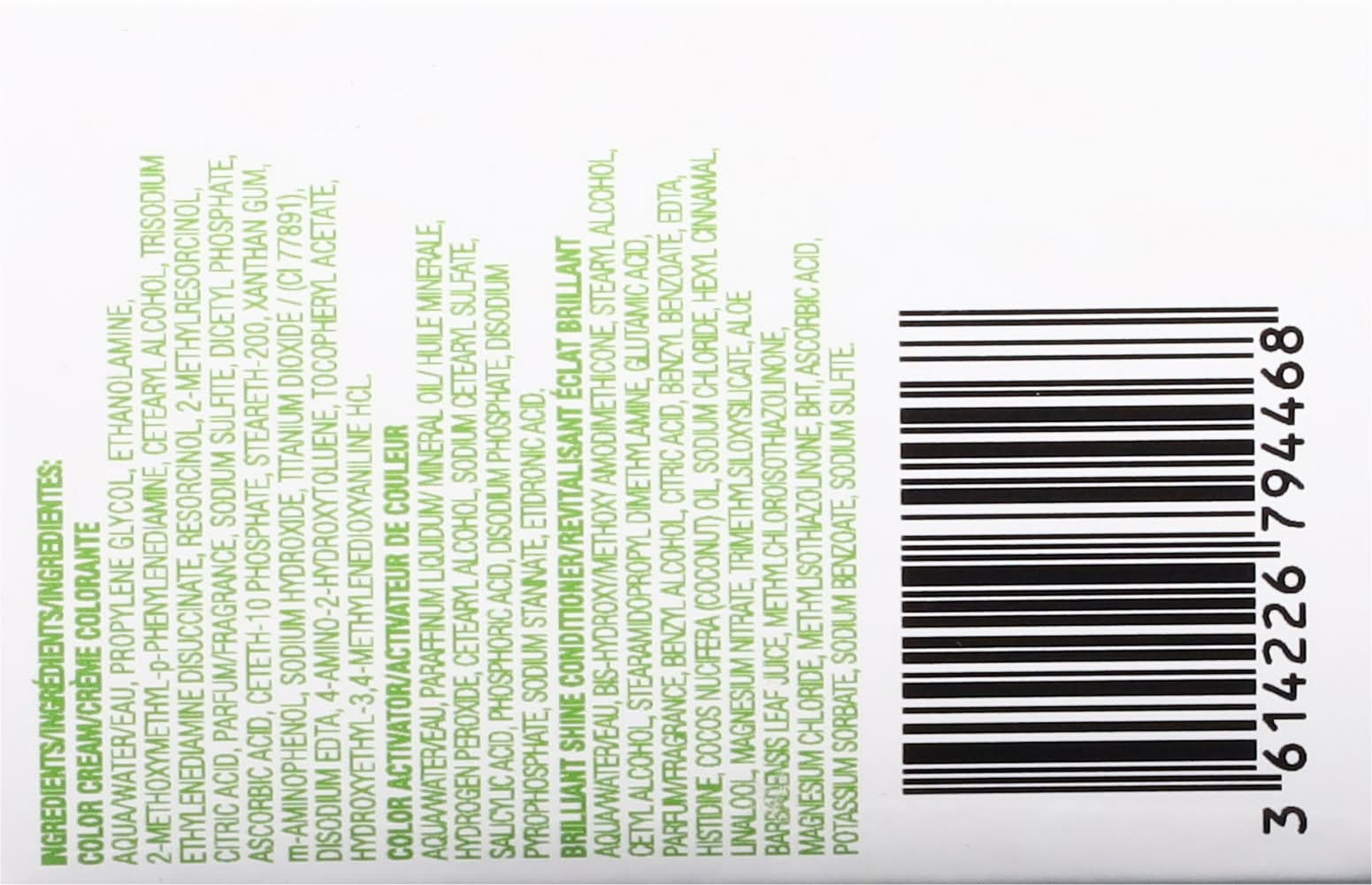 Ingredients: Color Cream: Aqua/Water/Eau, Propylene Glycol, Ethanolamine, 2-Methoxymethyl-p-Phenylenediamine, Cetearyl Alcohol, Trisodium Ethylenediamine Disuccinate, Resorcinol, 2-Methylresorcinol, Citric Acid, Parfum/Fragrance, Sodium Sulfite, Dicetyl Phosphate, Ascorbic Acid, Ceteth-10 Phosphate, Steareth-200, Xanthan Gum, M-Aminophenol, Sodium Hydroxide, Titanium Dioxide/ (CI 77891), Disodium EDTA, 4-Amino-2-Hydroxytoluene, Tocopheryl Acetate, Hydroxyethyl-3, 4-Methylenedioxyaniline HCL. Color Activator: Aqua/Water/Eau, Paraffinum Liquidum Mineral Oil, Hydrogen Peroxide, Cetearyl Alcohol, Sodium Cetearyl Sulfate, Salicylic Acid, Phosphoric Acid, Disodium Phosphate, Disodium Pyrophosphate, Sodium Stannate, Etidronic Acid. Brilliant Shine Conditioner: Aqua/Water/Eau, Bis-Hydroxy/Methoxy Amodimethicone, Stearyl Alcohol, Cetyl Alcohol, Stearamidopropyl Dimethylamine, Glutamic Acid, Parfum/Fragrance, Benzyl Alcohol, Citric Acid, Benzyl Benzoate, EDTA, Histidine, Cocos Nucifera (Coconut) Oil, Sodium Chloride, Hexyl Cinnamal, Linalool, Magnesium Nitrate, Trimethylsiloxysilicate, Aloe Barbadensis Leaf Juice, Methylchloroisothiazolinone, Magnesium Chloride, Methylisothiazolinone, BHT, Ascorbic Acid, Potassium Sorbate, Sodium Benzoate, Sodium Sulfate Contains: Sulfites