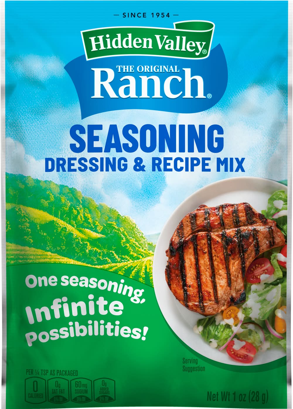 Spice up quick meals with Hidden Valley Original Ranch Seasoning Dressing and Recipe Mix. Made with a pre-portioned blend of zesty herbs and spices, this versatile ranch seasoning packet has endless culinary possibilities. The convenient packet is ready to rip open and start cookingit's perfect for making fresh, creamy ranch dressing or creating quick meals or snacks the family will love. Use this gluten free seasoning mix to whip up a dipping sauce for veggie platters, pizza, party wings and fries. Or, mix this ranch seasoning mix with other spices to use as a dry rub seasoning for pork chops. To make Hidden Valley Ranch Dressing, combine 1 cup whole milk and 1 cup mayonnaise with package contents. Mix well. Cover and refrigerate. Chill for 30 minutes to thicken, stirring before serving. Americas No. 1-selling ranch dressing, Hidden Valley is Ranch Done Right (1). (1) Based on IRI unit sales data L52W ending 8/25/24 for Hidden Valley Original RanchUsage Directions: Shake on to your favorite foods. Best if used by date on packet.Caution Statements: Product formulations, packaging and promotions may change. For the most current information refer to product packaging. The Hv Food Products Co., 1221Broadway,Oakland,CA,94612
