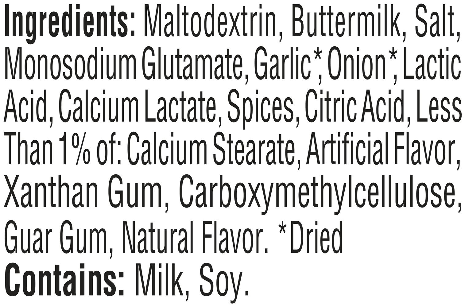 Ingredients: Maltodextrin, Buttermilk, Salt, Monosodium Glutamate, Garlic (2), Onion (2), Lactic Acid, Calcium Lactate, Spices, Citric Acid, Less Than 1% of: Calcium Stearate, Artificial Flavor, Xanthan Gum, Carboxymethylcellulose, Guar Gum, Natural Flavor. (2) Dried. Contains: Milk, Soy. Contains: Soy., Milk