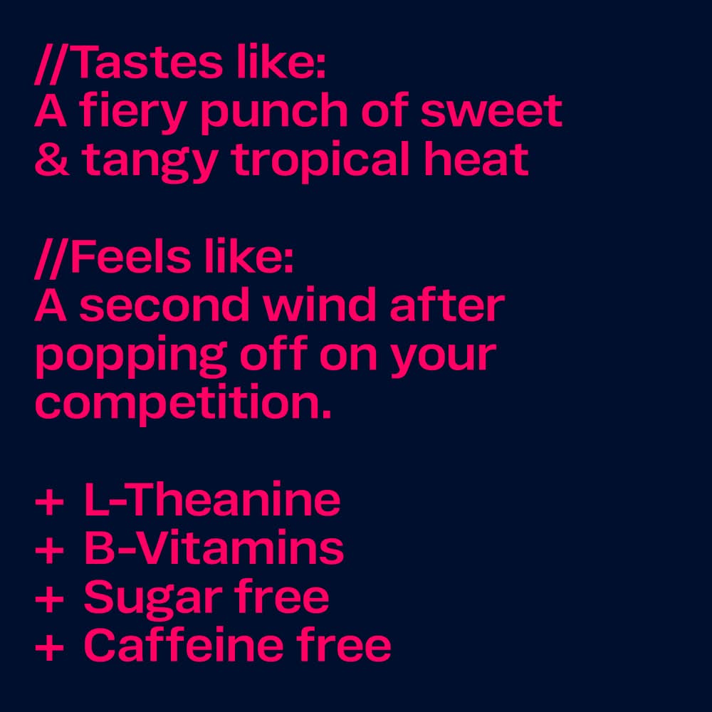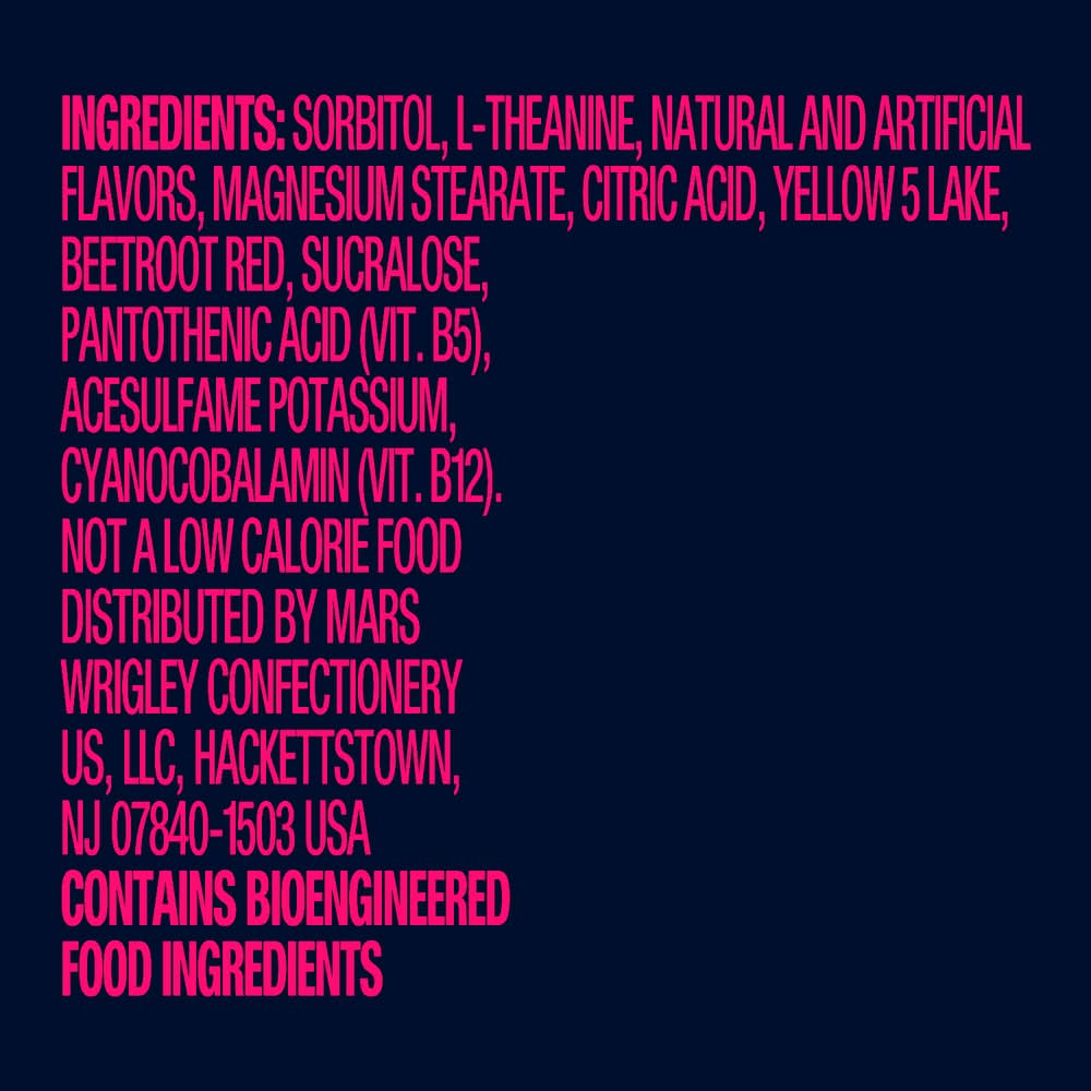 Ingredients: Sorbitol, L-Theanine, Natural And Artificial Flavors, Magnesiumstearate, Citric Acid, Yellow 5 Lake, Beetrootred, Sucralose, Pantothenicacid(Vit.B5), Acesulfamepotassium, Cyanocobalamin(Vit.B12)