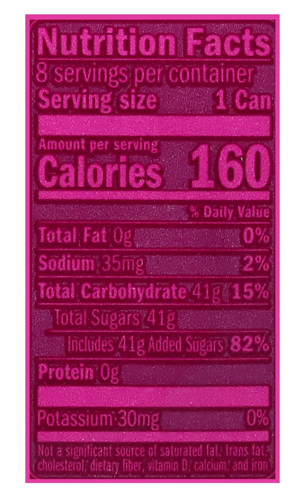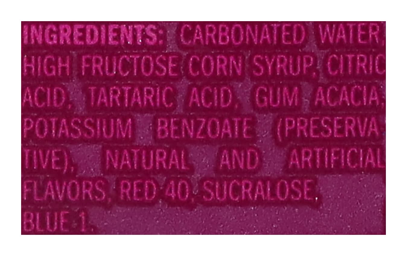 Ingredients: Carbonated Water, High Fructose Corn Syrup, Citric Acid, Tartaric Acid, Gum Acacia, Potassium Benzoate (Preservative), Natural and Artificial Flavors, Red 40, Sucralose, Blue 1