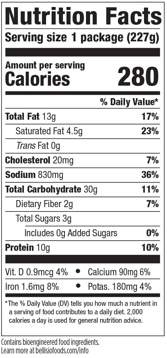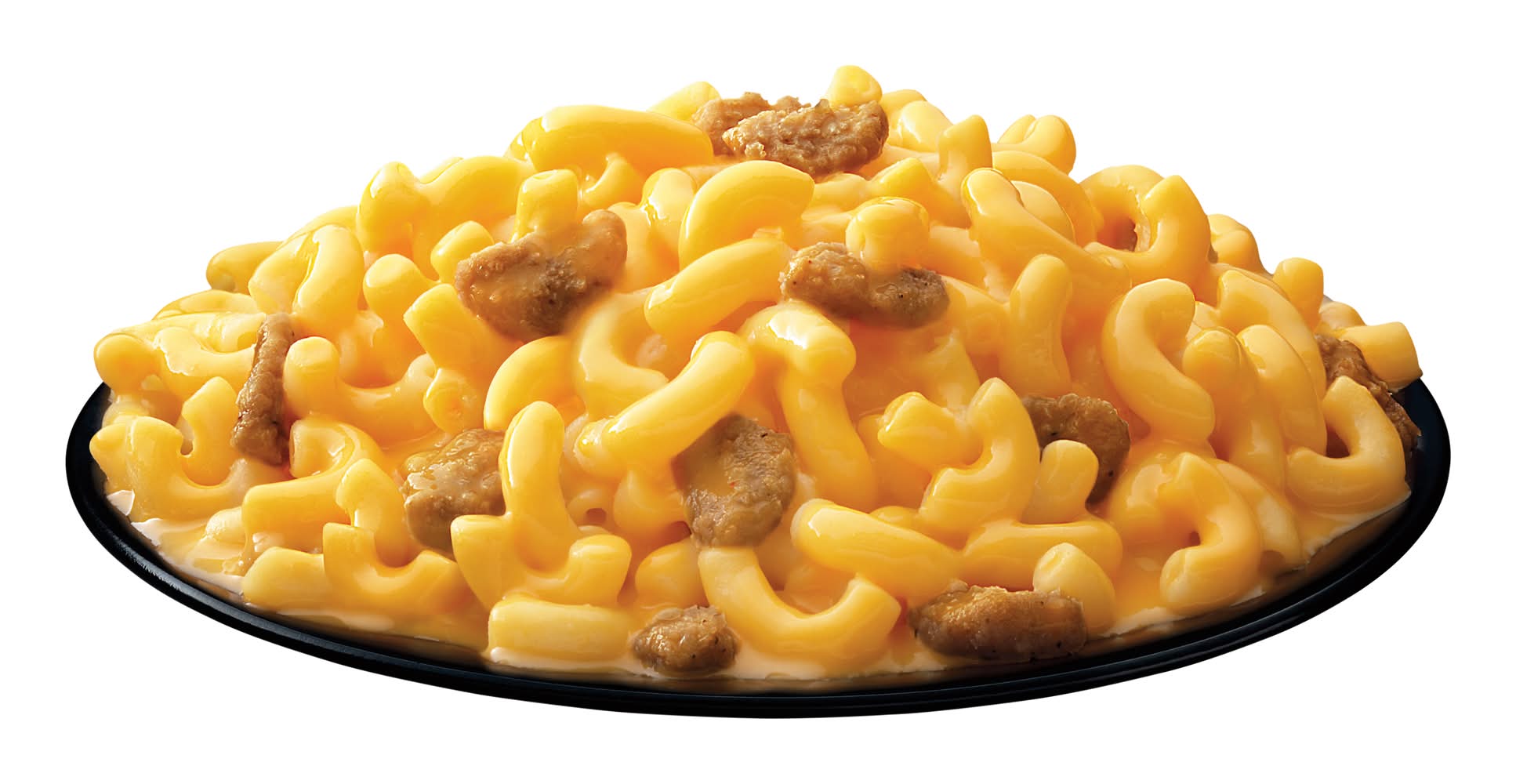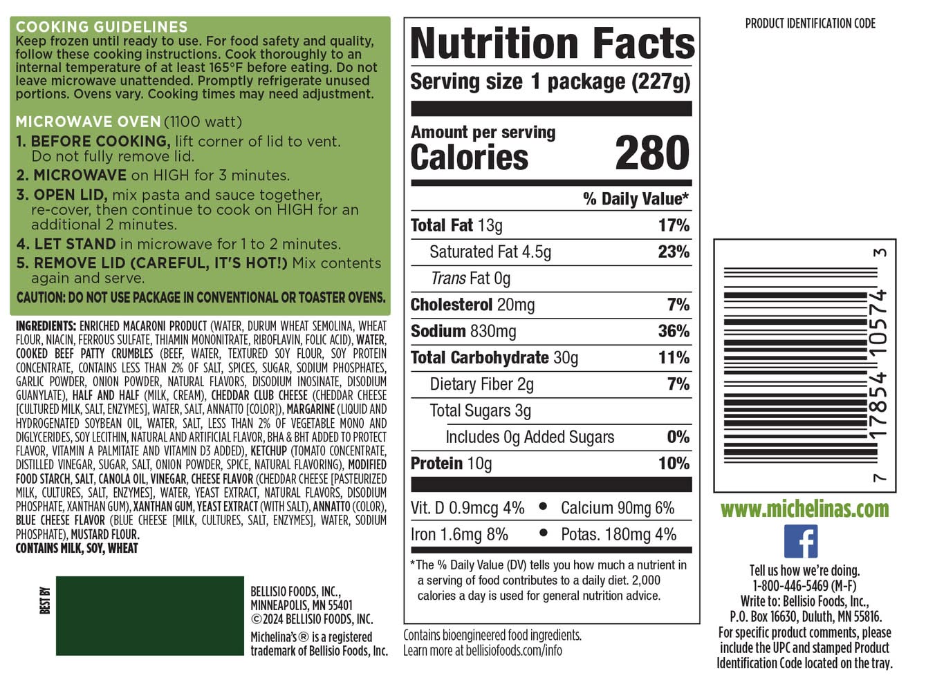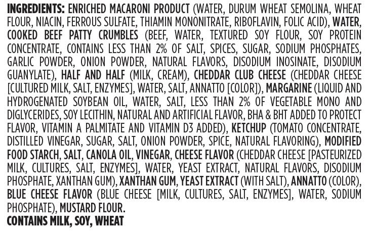 Ingredients: Cooked Enriched Macaroni Product Water, Durum Wheat Semolina, Wheat Flour, Niacin, Ferrous Sulfate, Thiamine Mononitrate, Riboflavin, Folic Acid, Water, Cooked Beef Patty Crumble Beef, Water, Isolated Soy Protein, Textured Vegetable Protein [Soy Flour, Caramel Color], Soy Sauce Powder [Soy Sauce {Fermented Soybeans, Wheat, Salt}, Maltodextrin, Salt], Modified Food Starch, Dehydrated Minced Onions, Salt, Sugar, Sodium Tripolyphosphate, Flavoring [Maltodextrin and Natural Flavor], Wheat Gluten, Celery Seeds, Half and Half Milk, Cream, Cheddar Club Cheese Cheddar Cheese [Cultured Milk, Salt, Enzymes], Water, Salt, Annatto [Color], Margarine Liquid and Hydrogenated Soybean Oil, Water, Salt, Less than 2% of Vegetable Mono and Diglycerides, Soy Lecithin, Natural and Artificial Flavor, BHA & BHT Added to Protect Flavor, Vitamin A Palmitate and Vitamin D3 Added, Contains Less than 2% of Ketchup Tomato Concentrate, Distilled Vinegar, Sugar, Salt, Onion Powder, Spices, Natural Flavoring, Modified Food Starch, Salt, Canola Oil, Vinegar, Cheese Flavor Cheddar Cheese [Pasteurized Milk, Cultures, Salt, Enzymes], Water, Yeast Extract, Natural Flavors, Disodium Phosphate, Xanthan Gum, Xanthan Gum, Yeast Extract, Annatto Color, Blue Cheese Flavor Blue Cheese [Milk, Cultures, Salt, Enzymes], Water, Sodium Phosphate, Mustard Flour. Contains: Milk, Soy, Wheat