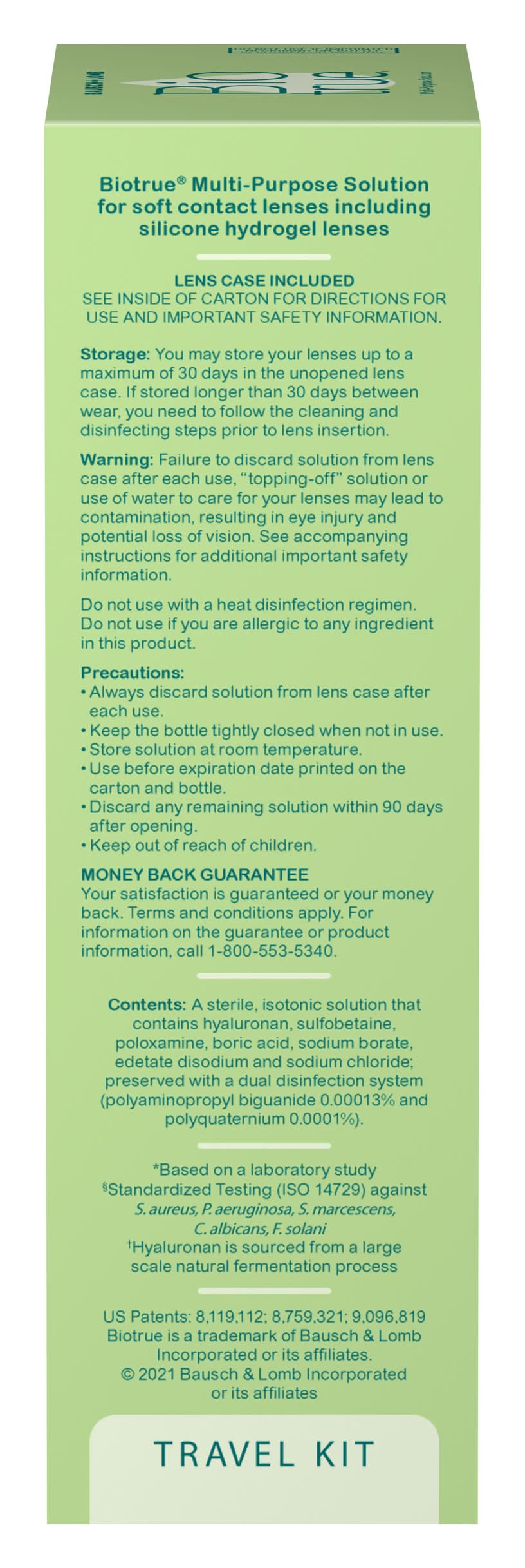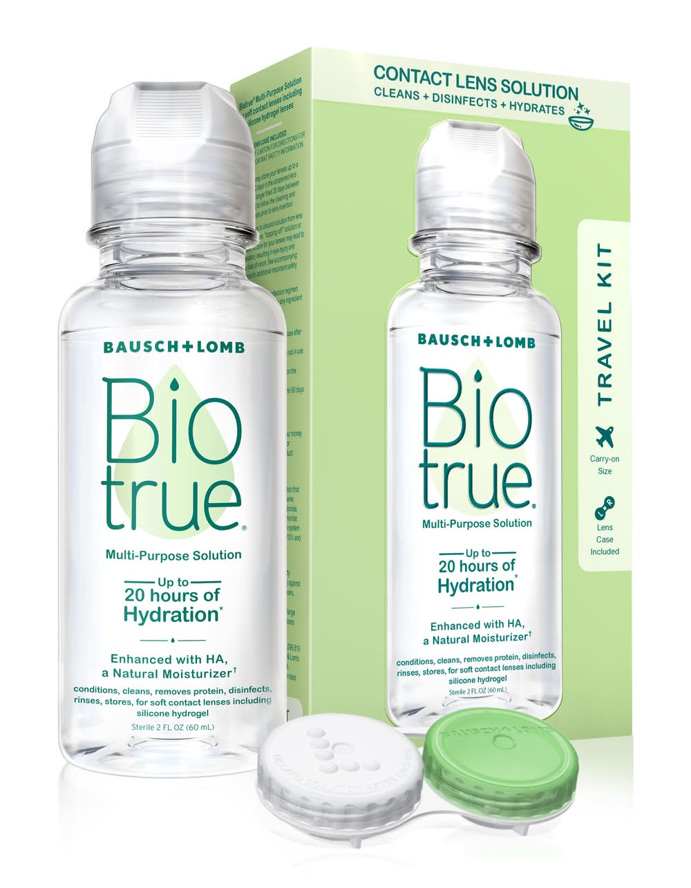 Lens case included. Up to 20 hours of moisture Our laboratory research shows that Biotrue multi-purpose solution helps keep lenses moist for up to 20 hours. We'd love to hear how multi-purpose solution is making wearing your contacts easier on your eyes. Works like your eyes. For soft contact lenses including silicone hydrogel lenses. Contents: multipurpose solution sterile 2 fl oz (60 ml), contact lens case. Makes wearing lenses easier on your eyes. pH balanced to match healthy tears. Kills 99.9% of gems. Conditions, cleans, removes protein, disinfects, rinses, stores, for soft contact lenses including silicone hydrogel lenses. Sterile. Multi-purpose solution for soft contact lenses including silicone hydrogel lenses. Works with your eyes. The world can be tough on your eyes when you wear contact lenses. In a world of less sleep and more computer use it can be difficult for your eyes to stay comfortable and moist, especially when wearing contacts. Biotrue is easier on your eyes because it works like your eyes, has the same pH as healthy tears and a lubricant found in your eyes. 100% Satisfaction Guaranteed. This carton and bottle are 100% recyclable.