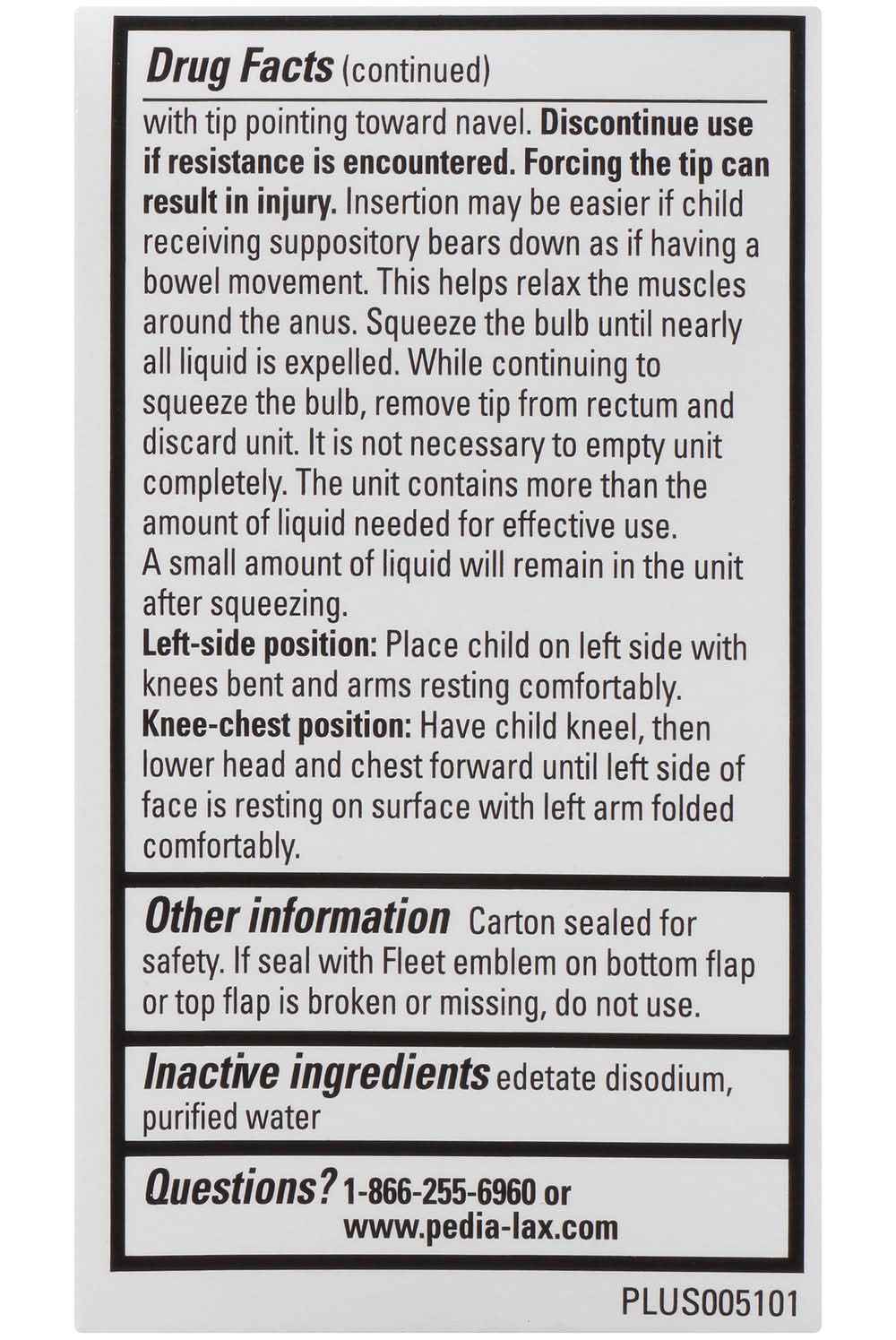 Directions: administering the laxative: caution: remove orange protective shield before inserting. hold unit upright, grasping bulb of unit with fingers. grasp orange protective shield with other hand, pull gently to remove. with steady pressure, gently insert tip into rectum with a slight side-to-side movement, with tip pointing toward navel. discontinue use if resistance is encountered. forcing the tip can result in injury. insertion may by easier if child receiving suppository bears down as if having a bowel movement. this helps relax the muscles around the anus. squeeze the bulb until nearly all liquid is expelled. while continuing to squeeze the bulb, remove tip from rectum and discard unit. it is not necessary to empty unit completely. the unit contains more than the amount of liquid needed for effective use. a small amount of liquid will remain in the unit after squeezing. left-side position: place child on left side with knees bent and arms resting comfortably. knee-chest position: have child kneel, then lower head and chest forward until left side of face is resting on surface with left arm folded comfortably. single daily dosage (per 24 hours): children 2 to under 6 years: 1 suppository per day or as directed by a doctor. children under 2 years: consult a doctor.