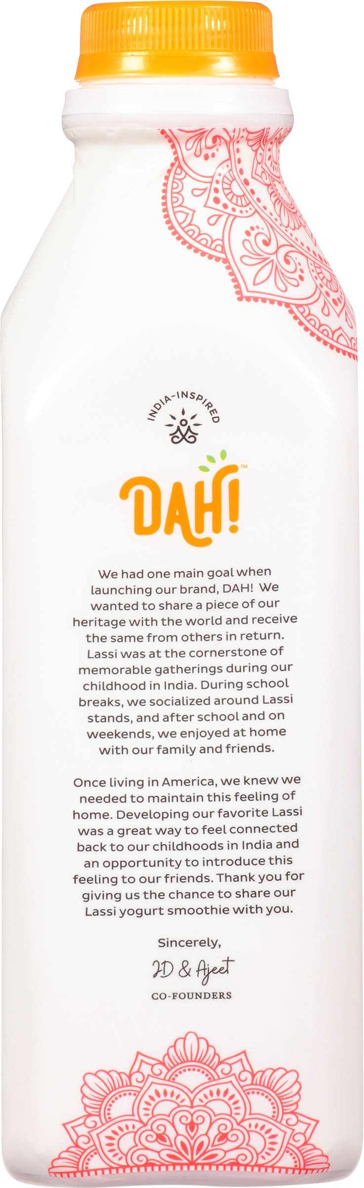 Gluten-Free. India - inspired. 15b probiotics. We had one main goal when launching our brand, DAH! We wanted to share a piece of our heritage with the world and receive the same from others in return. Lassi was at the cornerstone of memorable gatherings during our childhood in India. During school breaks, we socialized around Lassi stands, and after school and on weekends, we enjoyed at home with our family and friends. Once living in America, we knew we needed to maintain this feeling of home. Developing our favorite Lassi was a great way to feel connected back to our childhoods in India and an opportunity to introduce this feeling to our friends. Thank you for giving us the chance to share our Lassi yogurt smoothie with you. Sincerely, LD & Ajeet. Co - founders. Live DAHliciously! High - probiotic. Perfect for digestive health. Smooth and silky. Grade A. DAHlicious.com. (at)DAHlicious. DAHlicious.com • Dahlicious, LLC., • Packaging: Reusable