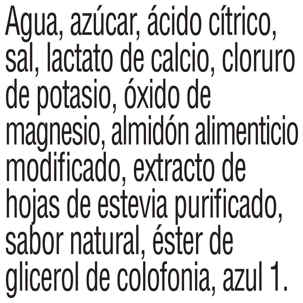 Ingredients: Water, Sugar, Citric Acid, Salt, Calcium Lactate, Potassium Chloride, Magnesium Oxide, Modified Food Starch, Purified Stevia Leaf Extract, Natural Flavor, Glycerol Ester Of Rosin, Blue 1