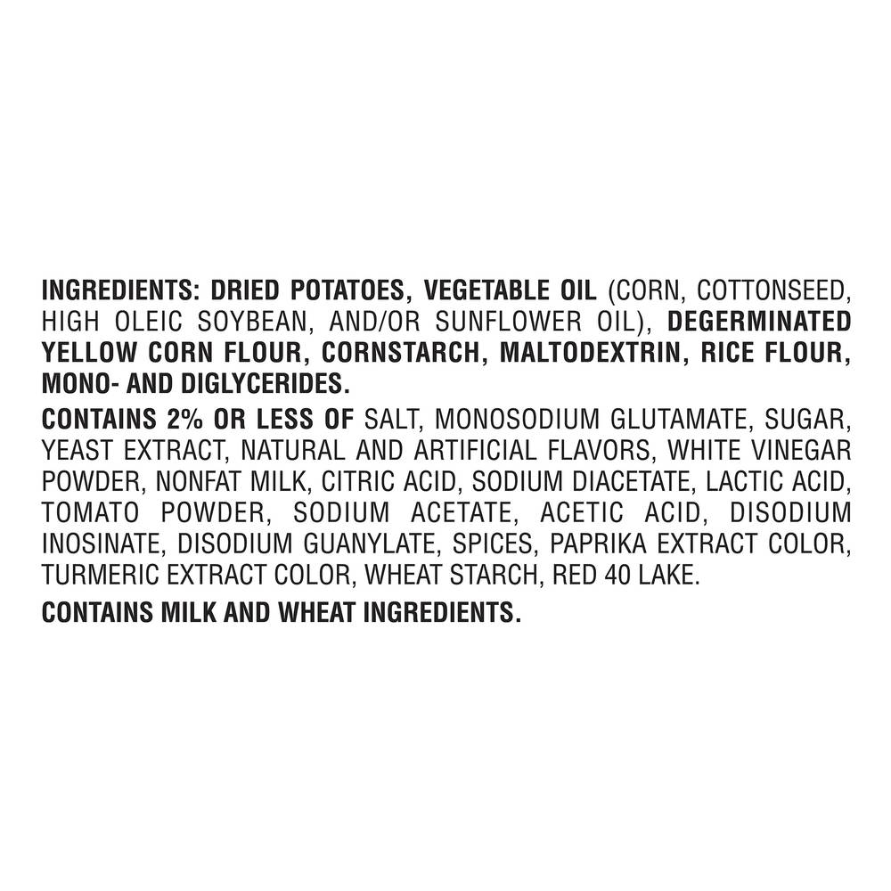 Dried Potatoes, Vegetable Oil (Corn, Cottonseed, High Oleic Soybean, and/or Sunflower Oil), Degerminated Yellow Corn Flour, Cornstarch, Maltodextrin, Rice Flour, Mono and Diglycerides, Contains 2% or Less of Salt, Monosodium Glutamate, Sugar, Yeast Extract, Natural and Artificial Flavors, White Vinegar Powder, Nonfat Milk, Citric Acid, Sodium Diacetate, Lactic Acid, Tomato Powder, Sodium Acetate, Acetic Acid, Disodium Inosinate, Disodium Guanylate, Spices, Paprika Extract Color, Turmeric Extract Color, Wheat Starch, Red 40 Lake. Contains: Milk, Wheat, Soybeans