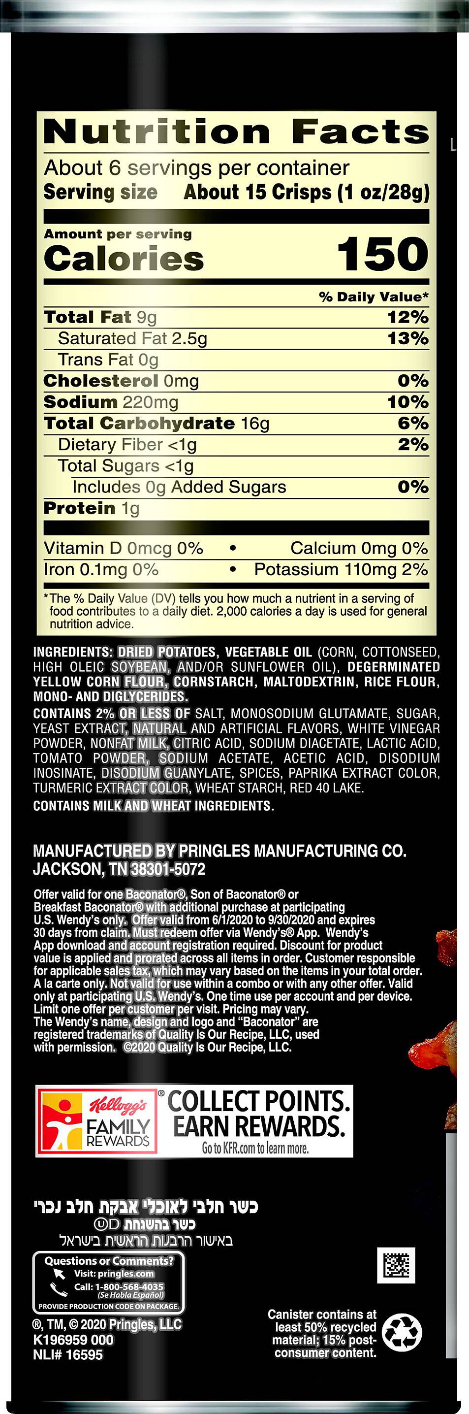 Potato Crisps, Baconator • Pringles Manufacturing, Jackson, TN, 38301-5072, Ph: 800-568-4035. • Packaging: Reusable