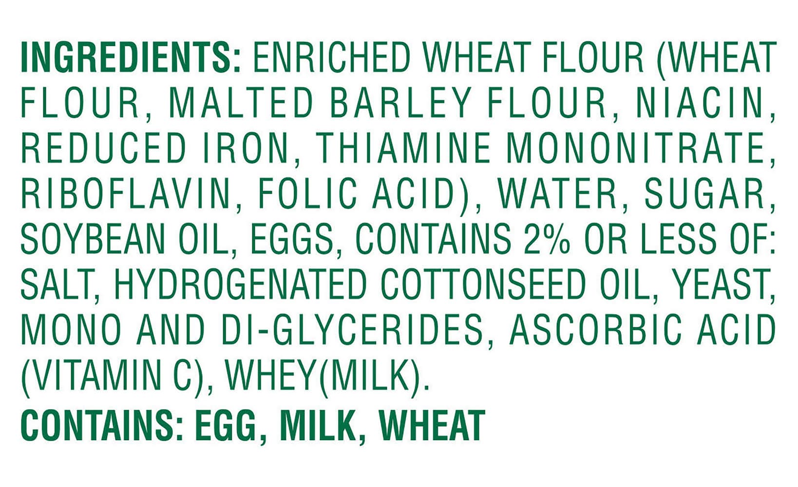 Ingredients: Enriched Wheat Flour (Wheat Flour, Malted Barley Flour, Niacin, Reduced Iron, Thiamine Mononitrate Riboflavin, Folic Acid), Water, Sugar, Soybean Oil, Eggs, Contains 2% or Less of: Salt, Hydrogenated Cottonseed Oil, Yeast, Mono and Di-Glycerides, Ascorbic Acid (Vitamin C), Whey (Milk) Contains: Eggs, Milk, Wheat, Barley, Soybeans