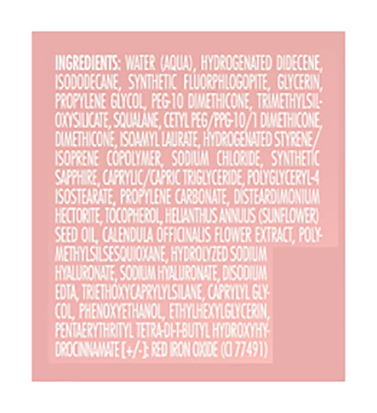 Ingredients: Water (Aqua), Hydrogenated Didecene, Isododecane, Synthetic Fluorphlogopite, Glycerin, Propylene Glycol, PEG-10 Dimethicone, Trimethylsiloxysilicate, Squalane, Cetyl PEG/PPG-10/1 Dimethicone, Dimethicone, Isoamyl Laurate, Hydrogenated Styrene/Isoprene Copolymer, Sodium Chloride, Synthetic Sapphire, Caprylic/Capric Triglyceride, Polyglyceryl-4 Isostearate, Propylene Carbonate, Disteardimonium Hectorite, Tocopherol, Helianthus Annuus (Sunflower) Seed Oil, Calendula Officinalis Flower Extract, Polymethylsilsesquioxane, Hydrolyzed Sodium Hyaluronate, Sodium Hyaluronate, Disodium EDTA, Triethoxycaprylylsilane, Caprylyl Glycol, Phenoxyethanol, Ethylhexylglycerin, Pentaerythrityl Tetra-Di-T-Butyl Hydroxyhydrocinnamate, [+/-]: Red Iron Oxide (CI 77491)