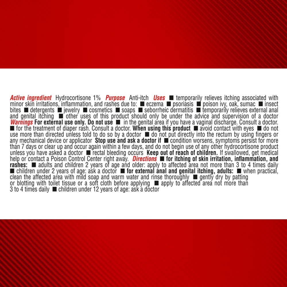 Ingredients: Active Ingredients: Hydrocortisone (1 %), Anti-itch. Inactive Ingredients: Water, Glycerin, Petrolatum, Jojoba Esters, Cetyl Alcohol, Aloe Barbadensis Leaf Juice, Stearyl Alcohol, Distearyldimonium Chloride, Cetearyl Alcohol, Steareth-2, Steareth-21, Magnesium Ascorbyl Phosphate, Chamomilla Recutita (Matricaria) Flower Extract, Hydrolyzed Jojoba Esters, Tocopheryl Acetate, Niacinamide, Polysorbate 60, Stearamidopropyl PG-Dimonium Chloride Phosphate, Dimethicone, Glyceryl Stearate, Hydroxyacetophenone, Methyl Gluceth-20, Menthyl Lactate, Propylene Glycol, Ethylhexylglycerin, PPG-12/SMDI Copolymer, Disodium EDTA, Beta-Glucan. Additives: Water, Glycerin, Petrolatum, Jojoba Esters, Cetyl Alcohol, Aloe Barbadensis Leaf Juice, Stearyl Alcohol, Distearyldimonium Chloride, Cetearyl Alcohol, Steareth-2, Steareth-21, Magnesium Ascorbyl Phosphate, Chamomilla Recutita (Matricaria) Flower Extract, Hydrolyzed Jojoba Esters, Tocopheryl Acetate, Niacinamide, Polysorbate 60, Stearamidopropyl PG-Dimonium Chloride Phosphate, Dimethicone, Glyceryl Stearate