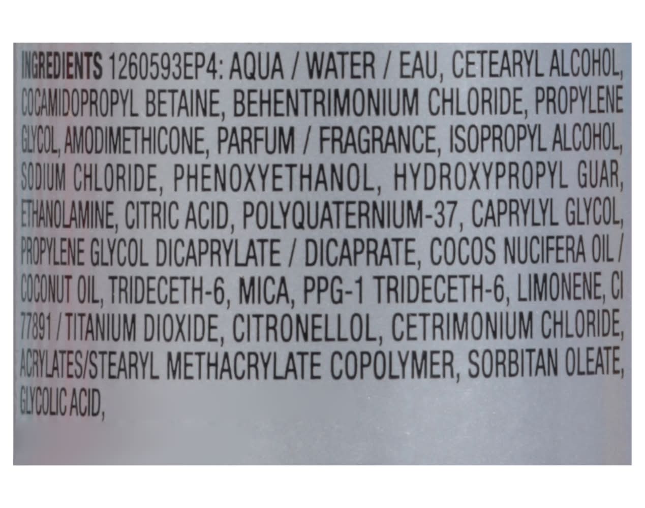 Ingredients: Aqua/Water/Eau, Cetearyl Alcohol, Cocamidopropyl Betaine, Behentrimonium Chloride, Propylene Glycol, Amodimethicone, Parfum/Fragrance, Isopropyl Alcohol, Sodium Chloride, Phenoxyethanol, Hydroxypropyl Guar, Ethanolamine, Citric Acid, Polyquaternium-37, Caprylyl Glycol, Propylene Glycol Dicaprylate/Dicaprate, Cocos Nucifera Oil/Coconut Oil, Trideceth-6, Mica, PPG-1 Trideceth-6, Limonene, CI 77891/Titanium Dioxide, Citronellol, Cetrimonium Chloride, Acrylates/Stearyl Methacrylate Copolymer, Sorbitan Oleate, Glycolic Acid, EDTA. F.I.L. #T70052237/1 Contains: Tree Nuts, Coconuts