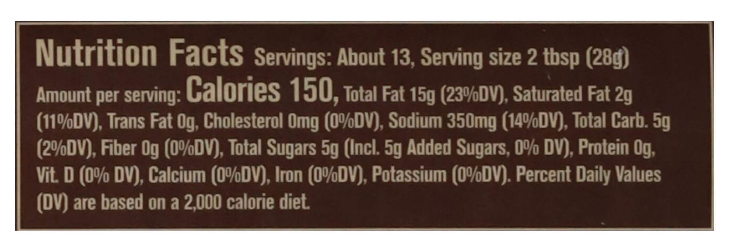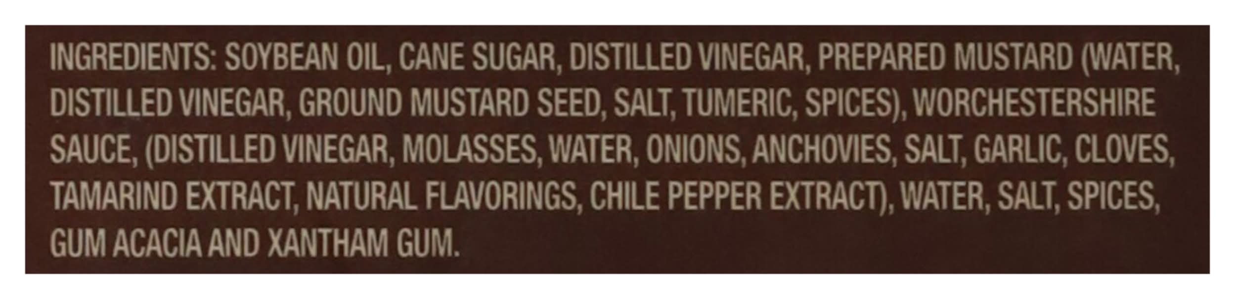 Soybean Oil, Cane Sugar, Distilled Vinegar, Prepared Mustard (Water, Distilled Vinegar, Ground Mustard Seed, Salt, Tumeric, Spices), Worchestershire Sauce, (Distilled Vinegar, Molasses, Water, Onions, Anchovies, Salt, Garlic, Cloves, Tamarind Extract, Natural Flavorings, Chile Pepper Extract), Water, Salt, Spices, Gum Acacia and Xantham Gum Contains: Soybeans, Mustard, Fish, Anchovy
