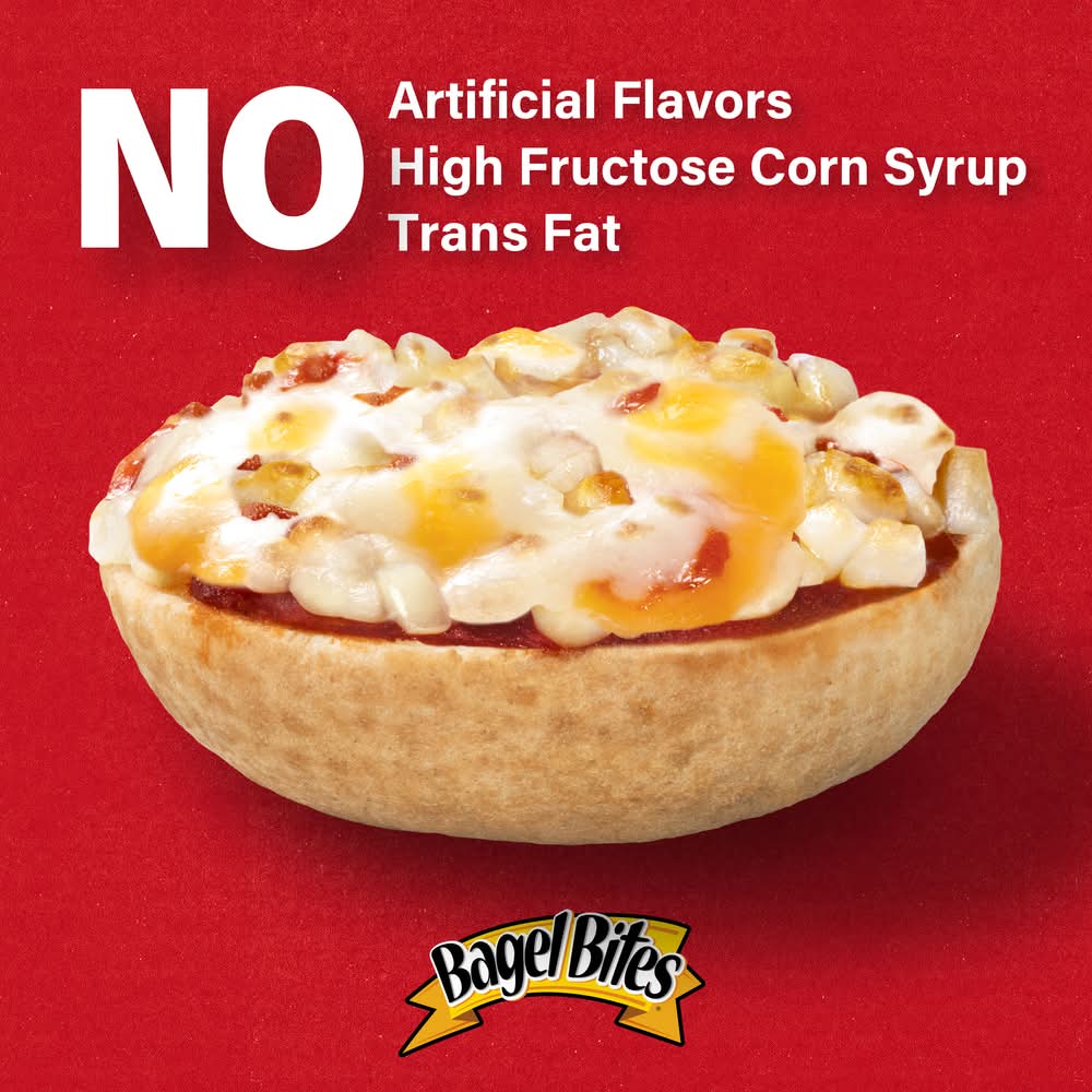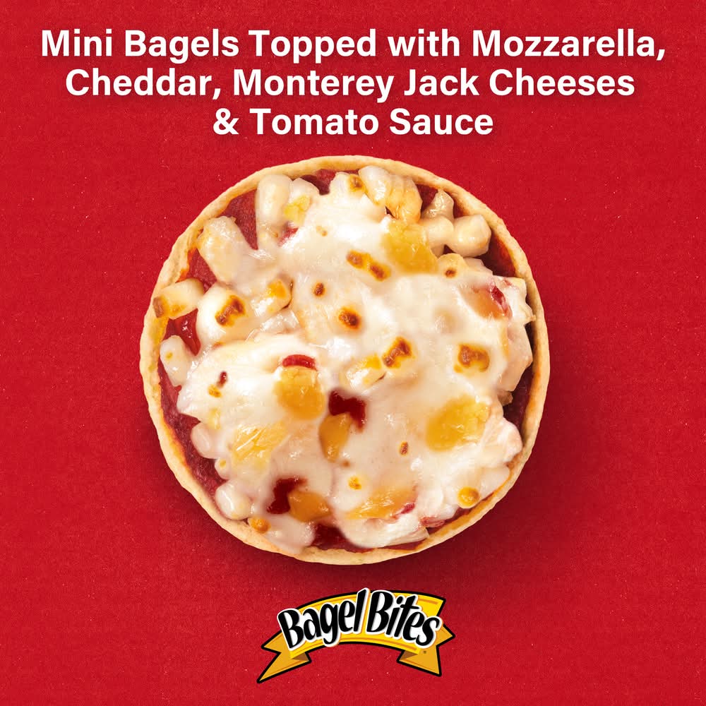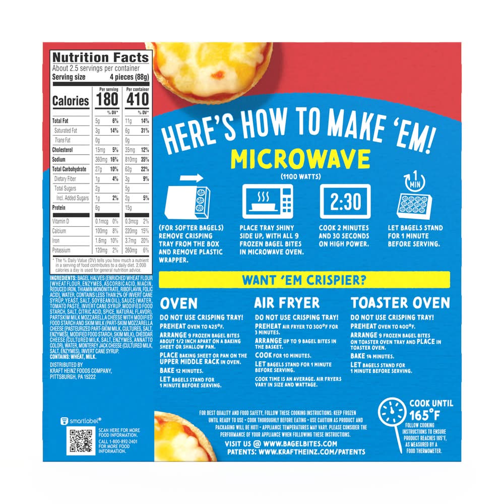 Bagel Bites Three Cheese Pizza Snacks offer a quick and easy snack that kids love and parents can easily serve. Our mini pizza bagels are topped with mozzarella cheese, cheddar cheese, Monterey Jack cheese and tomato pizza sauce for a mouthwatering flavor that excites taste buds. Whenever you serve our mini pizza bagels, they're always a hit. Try our frozen appetizers at a party or as an after school snack. Each serving of Bagel Bites has 6 grams of protein and contains 0g trans fat, and no artificial flavors or high-fructose corn syrup. Suggested serving size is 4 pieces (88g). Cook them in an air fryer, oven or toaster oven for a crispy finish, or microwave them for a quick snack. Each 9-count box of Bagel Bites Three Cheese Pizza Snacks includes a convenient microwavable crisping tray for easy prep. Keep our mini cheese pizza bagels frozen until ready to eat. • Flavor: Cheese • Kraft heinz foods company, Pittsburgh,PA,15222
