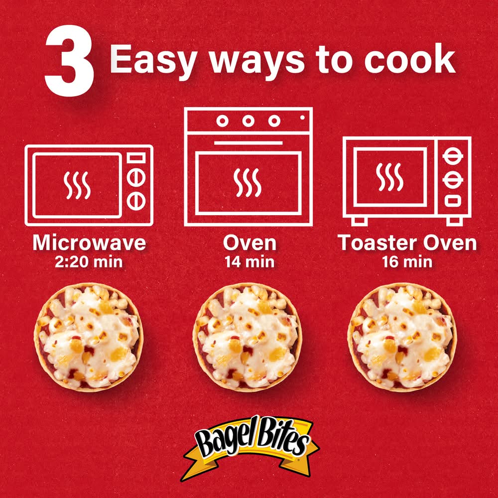 Directions for use: Bake: Oven Do not use crisping tray! Preheat oven to 425������F. Arrange 9 frozen Bagel Bites about 1/2 inch apart on a baking sheet or shallow pan. Place baking sheet or pan on the upper middle rack in oven. Bake 12 minutes. Let bagels stand for 1 minute before serving. Toaster Oven Do not use crisping tray! Preheat oven to 400������F. Arrange 9 frozen Bagel Bites on toaster oven tray and place in toaster oven. Bake 14 minutes. Let bagels stand for 1 minute before serving. Microwave: 2:30 min Microwave 1100 Watts (For Softer Bagels) Remove crisping tray from the box and remove plastic wrapper. Place tray shiny side up, with all 9 frozen Bagel Bites in microwave oven. Cook 2 minutes and 30 seconds on high power. Let bagels stand for 1 minute before serving. Keep frozen. Storage recommendation: Keep frozen.