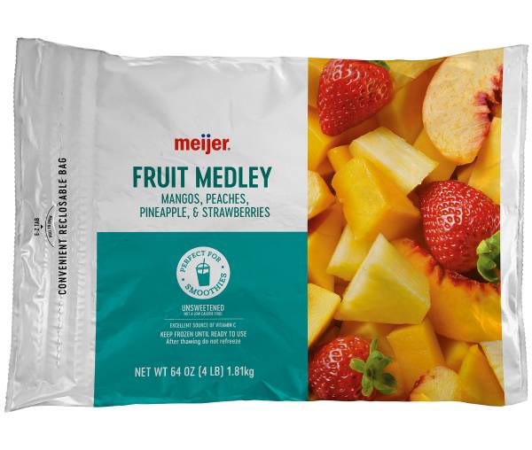 Meijer Frozen Fruit Medley is a blend of mango, pineapple, peaches, and strawberries, packaged as a frozen product. It is suitable for use in yogurt bowls, smoothies, and a variety of other recipes, designed to enhance the taste of dishes with a sweet fruit mix.