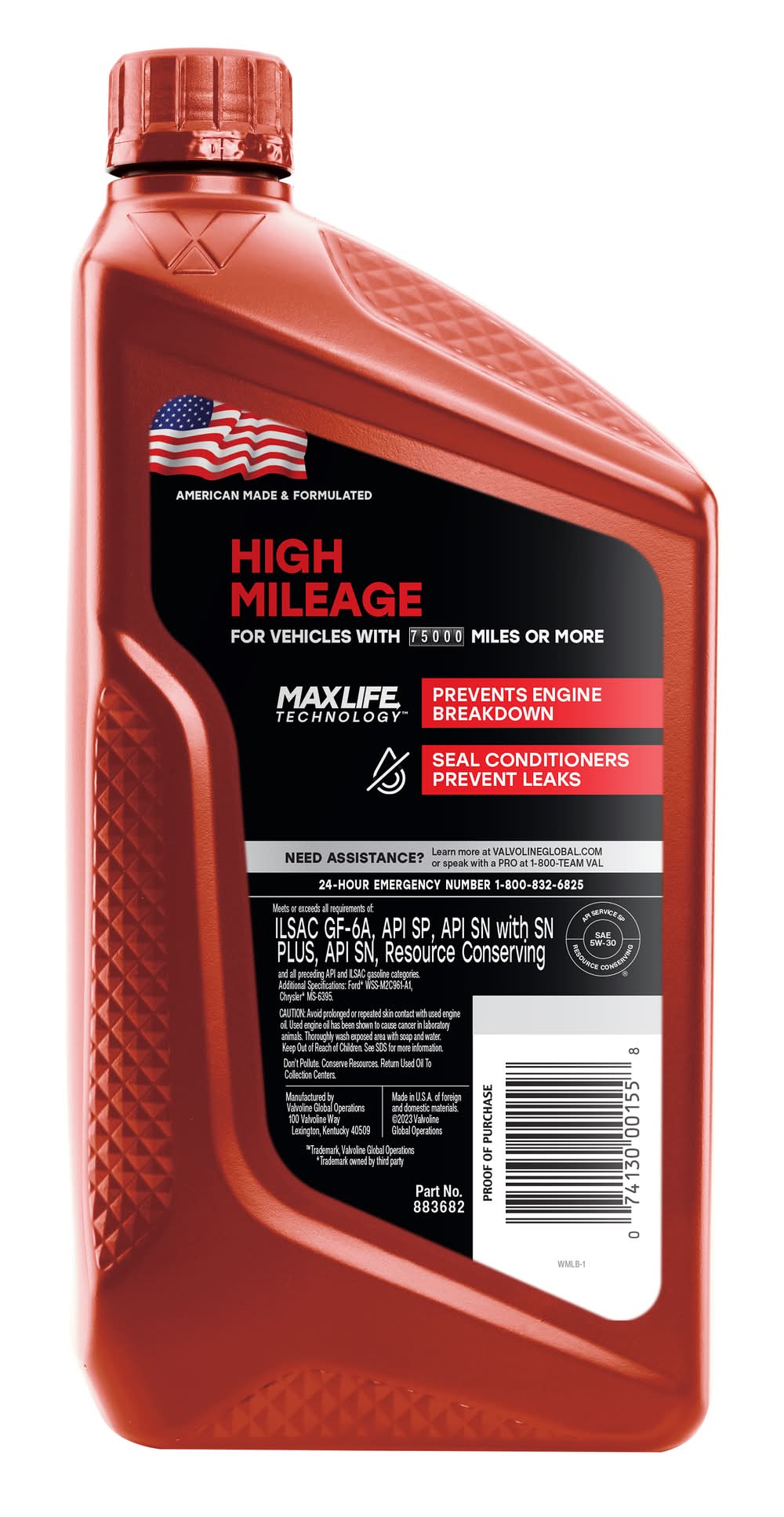Valvoline Maxlife 5W-30 Motor Oil is designed for gasoline engines and is suitable for use in vehicles with over 75,000 miles. It incorporates Maxlife technology and meets or exceeds the requirements of API services SN/SM, ILSAC GF-5, as well as all preceding API and ILSAC gasoline categories. This product also meets wear requirements for North American, Asian, and European vehicles and complies with additional specifications such as Ford WSS-M2C946-A and Chrysler MS-6395. It is produced in the United States from both foreign and domestic materials. • Valvoline Llc, 100 Valvoline Way, Lexington, Ky, 40509 • Packaging: Reusable