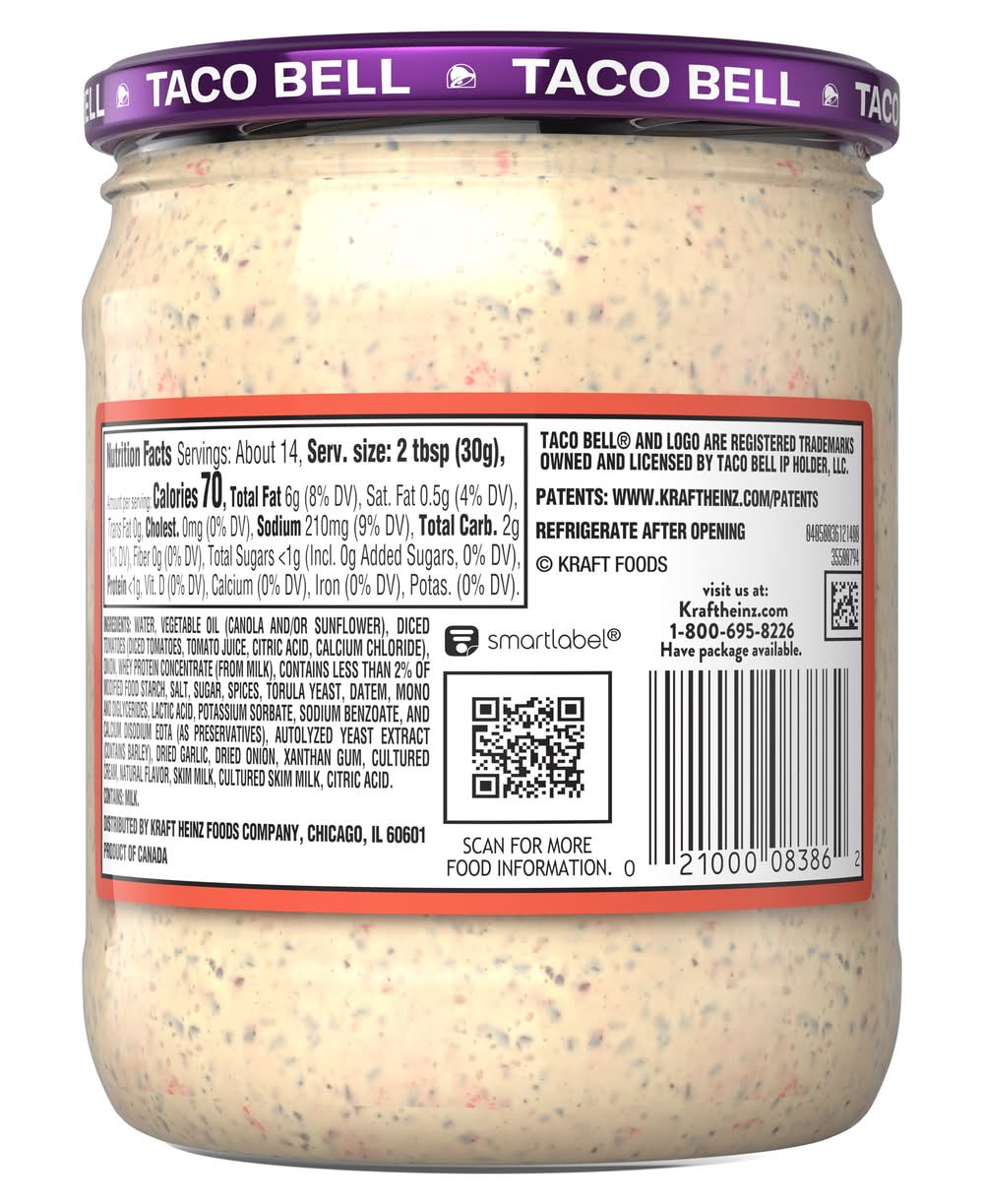 Ingredients: WATER, VEGETABLE OIL (CANOLA AND/OR SUNFLOWER), DICED TOMATOES (DICED TOMATOES, TOMATO JUICE, CITRIC ACID, CALCIUM CHLORIDE), ONION, WHEY PROTEIN CONCENTRATE (FROM MILK), CONTAINS LESS THAN 2% OF MODIFIED FOOD STARCH, SALT, SUGAR, SPICES, TORULA YEAST, DATEM, MONO AND DIGLYCERIDES, LACTIC ACID, POTASSIUM SORBATE, SODIUM BENZOATE, AND CALCIUM DISODIUM EDTA (AS PRESERVATIVES), AUTOLYZED YEAST EXTRACT (CONTAINS BARLEY), DRIED GARLIC, DRIED ONION, XANTHAN GUM, CULTURED CREAM, NATURAL FLAVOR, SKIM MILK, CULTURED SKIM MILK, CITRIC ACID. Contains: CONTAINS: MILK.