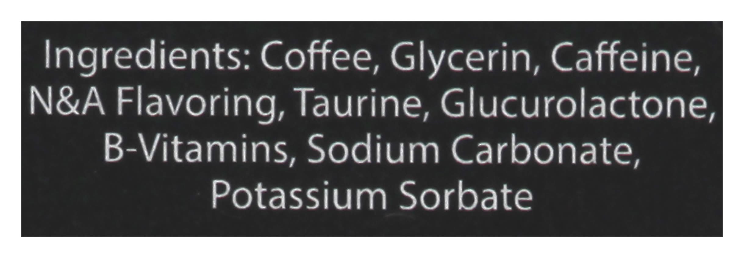 Coffee, Glycerin, Caffeine, N&A Flavoring, Taurine, Glucuronolactone, B-Vitamins, Sodium Carbonate, Potassium Sorbate