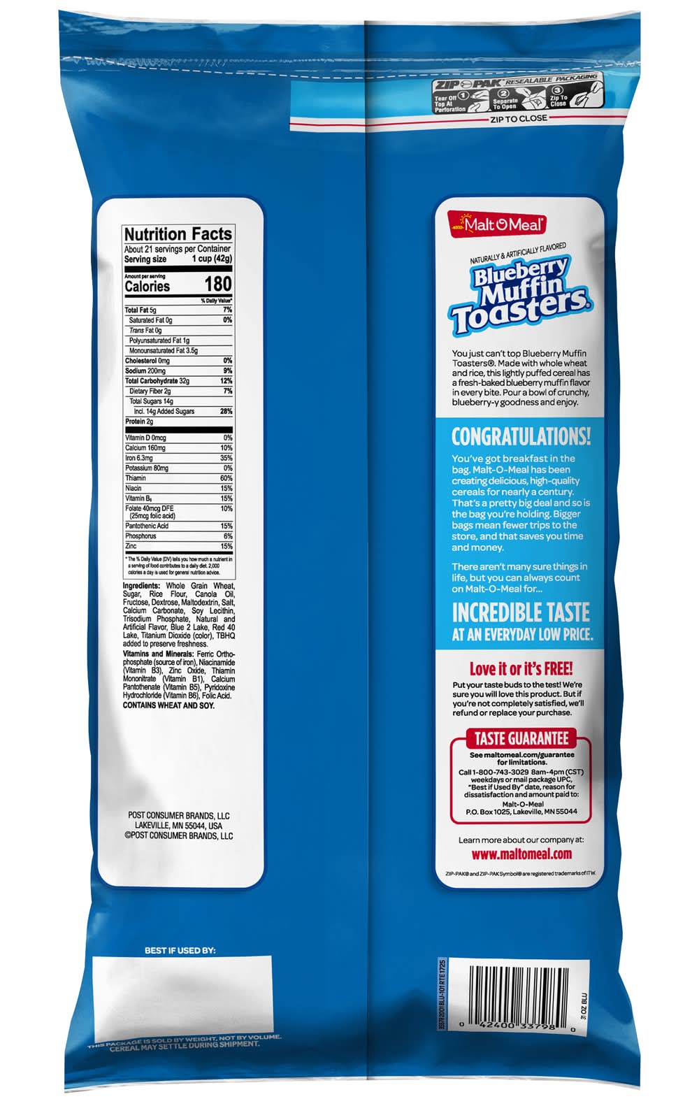 They're back! Malt-O-Meal® Blueberry Muffin Toasters® is a lightly puffed cereal made with whole wheat and rice. You just can’t top the fresh-baked blueberry muffin flavor in every bite. Pour a bowl of crunchy, blueberry goodness and enjoy! Post Consumer Brands, Lakeville, MN, 55044, Ph: 800-743-3029