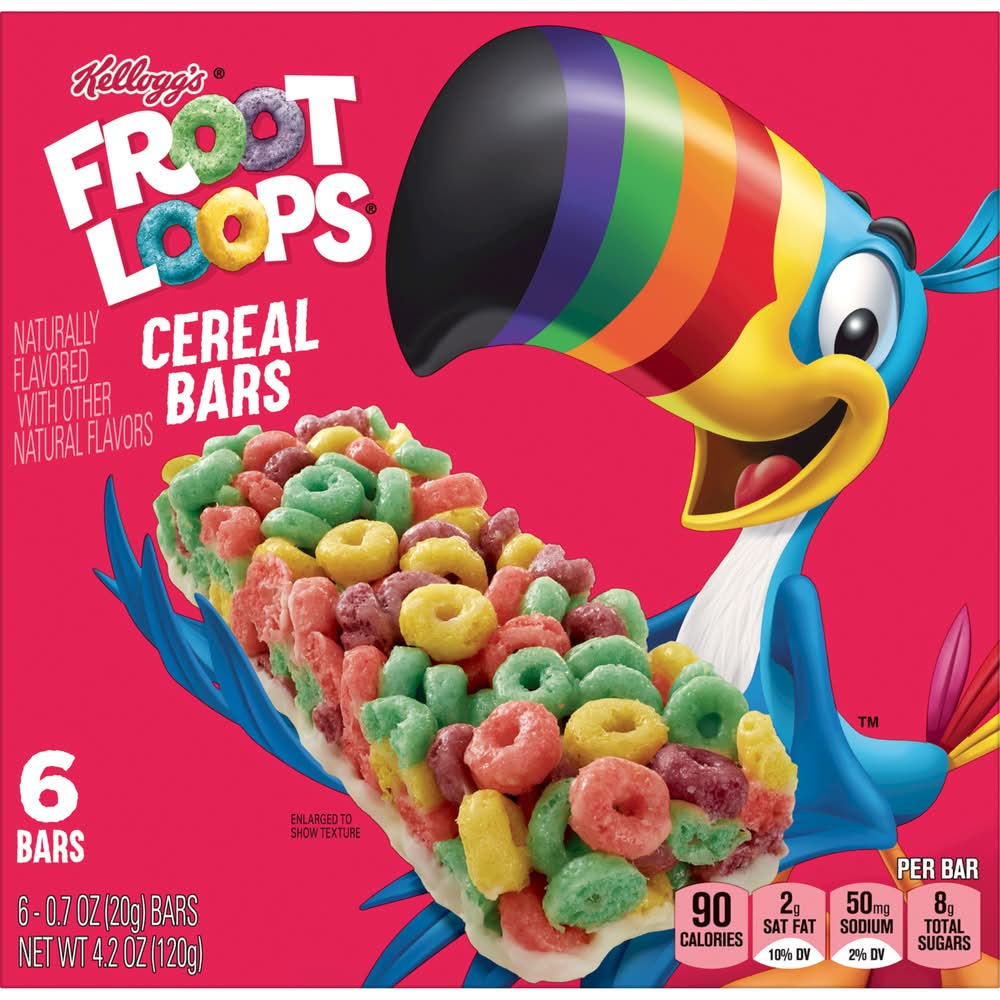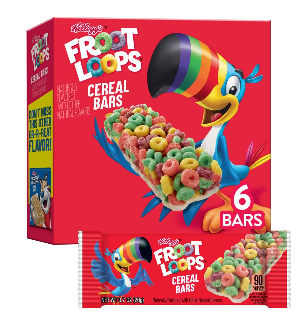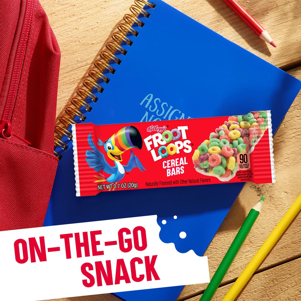 Take the fruity taste that the whole family loves on the go with Kellogg's Froot Loops cereal bars. Based on the popularity of our Froot Loops cereal, we've packed our vibrant, colorful, crunchy loops into the convenient shape of a perfectly portable bar. These tasty cereal bars make a great breakfast item that kids can enjoy when they are craving Kellogg's Froot Loops, but don't have time to sit down with a bowl. Pack one to eat in the car or on the bus on the way to school. Perfect as a handheld lunch box or classroom snack. They're ideal treats to hand out to the team after sports games and practice. You'll want to stock up and keep a box of Kellogg's Froot Loops cereal bars for yourself and still have some to share. Kellogg Sales, Battle Creek, MI,49016