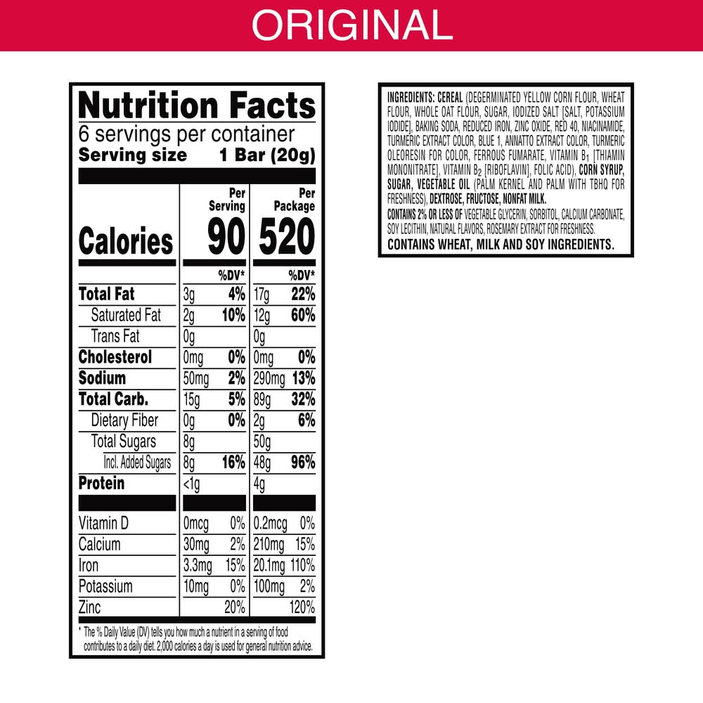 Cereal (Degerminated Yellow Corn Flour, Wheat Flour, Whole Oat Flour, Sugar, Iodized Salt [Salt, Potassium Iodide], Baking Soda, Reduced Iron, Zinc Oxide, Red 40, Niacinamide, Turmeric Extract Color, Blue 1, Annatto Extract Color, Turmeric Oleoresin For Color, Ferrous Fumarate, Vitamin B1 [Thiamin Mononitrate], Vitamin B2 [Riboflavin], Folic Acid), Corn Syrup, Sugar, Vegetable Oil (Palm Kernel And Palm With Tbhq For Freshness), Dextrose, Fructose, Nonfat Milk. Contains 2% Or Less Of Vegetable Glycerin, Sorbitol, Calcium Carbonate, Soy Lecithin, Natural Flavors, Rosemary Extract For Freshness. Contains: Contains wheat, milk and soy ingredients.