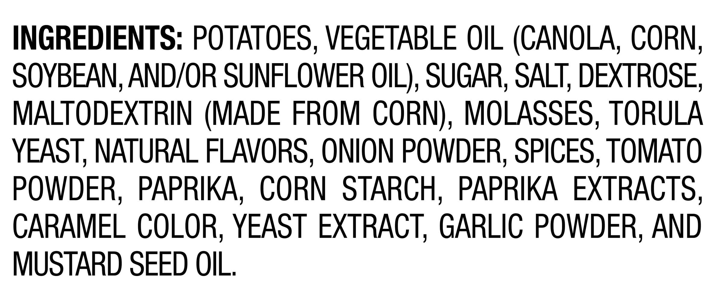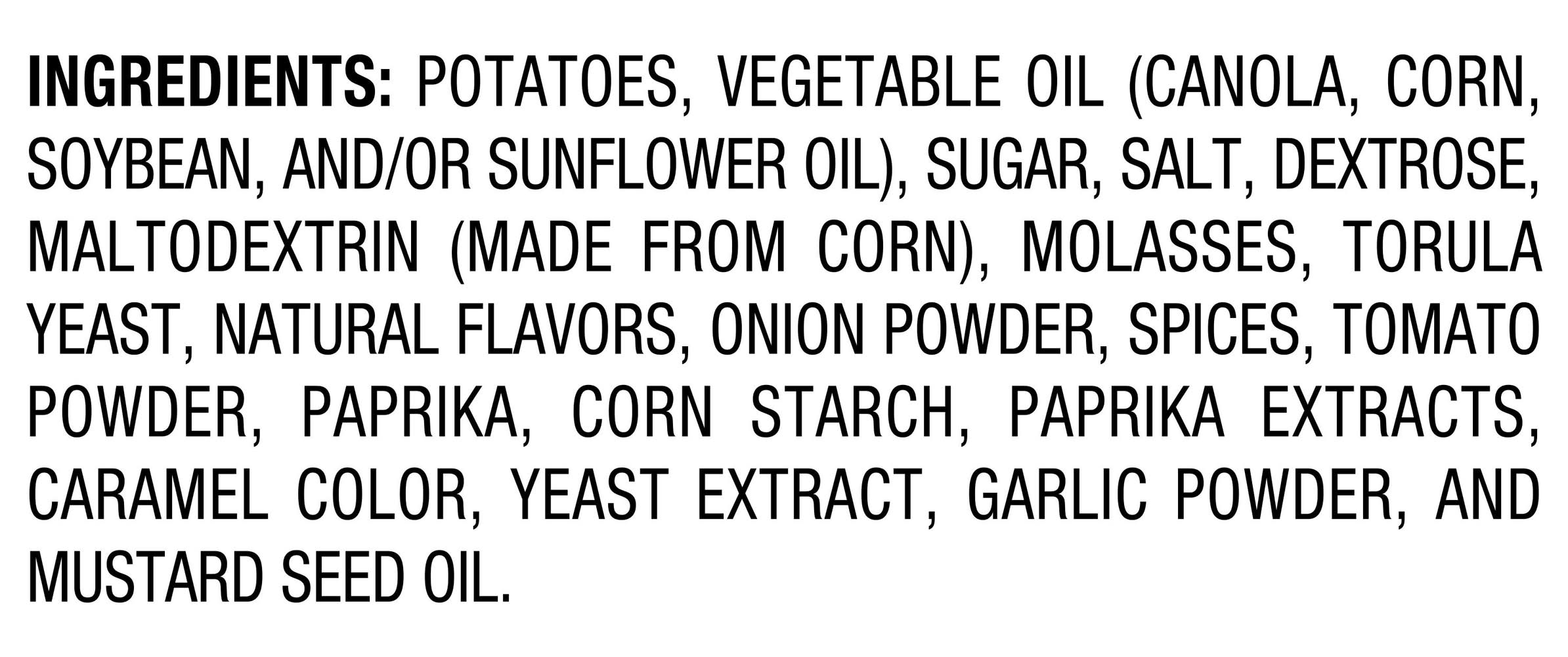 Ingredients: Potatoes, Vegetable Oil (Canola, Corn, Soybean, And/Or Sunflower Oil), Sugar, Salt, Dextrose, Maltodextrin (Made From Corn), Molasses, Torula Yeast, Natural Flavors, Onion Powder, Spices, Tomato Powder, Paprika, Corn Starch, Paprika Extracts, Caramel Color, Yeast Extract, Garlic Powder, And MUSTARD Seed Oil. Contains: Soybeans
