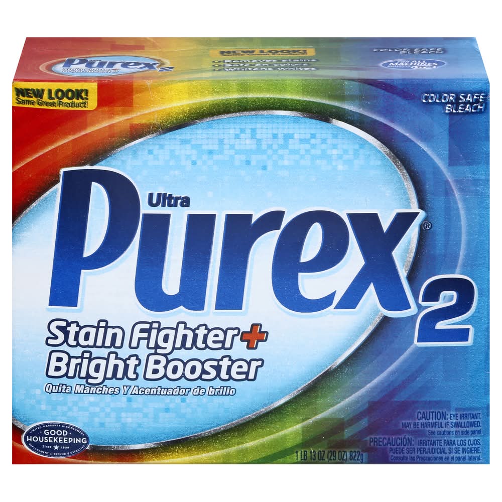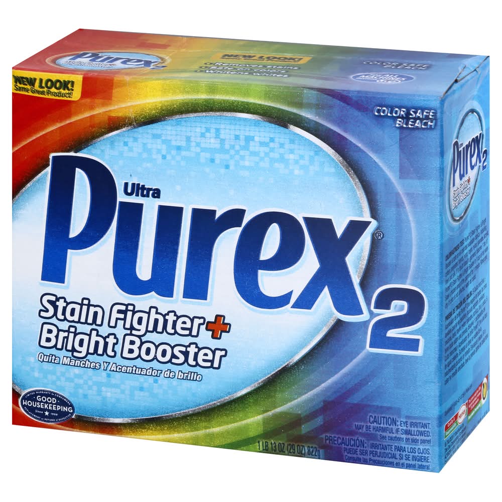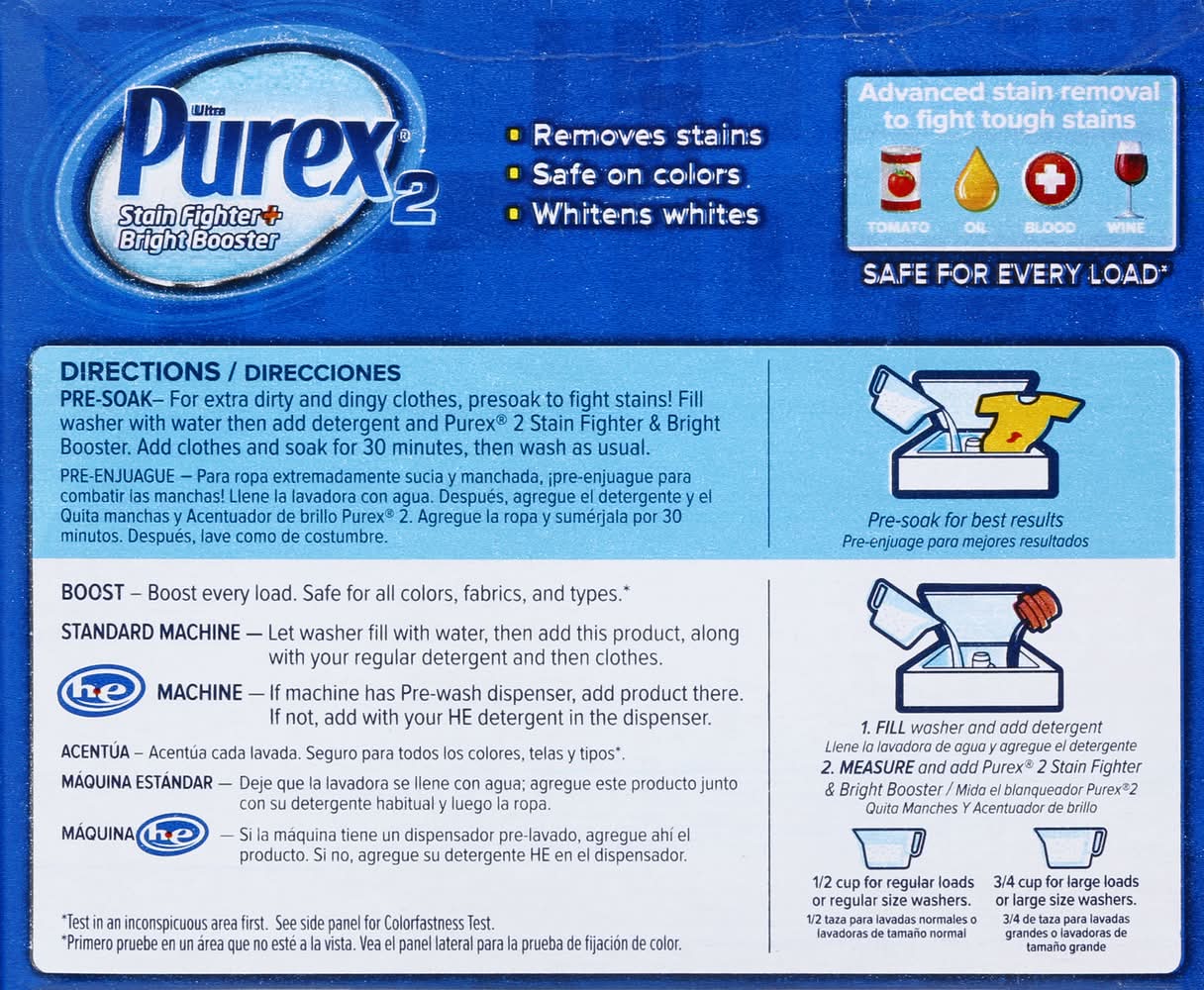 Pre-Soak: For extra dirty and dingy clothes, presoak to fight stains! Fill washer with water then add detergent and Purex 2 Stain Fighter & Bright Booster. Add clothes and soak for 30 minutes, then wash as usual. Boost - Boost every load. Safe for all colors, fabrics, and types (Test in an inconspicuous area first. See side panel for colorfastness test). Standard Machine - Let washer fill with water, then add this product along with your regular detergent and then clothes. Machine - If machine has pre-wash dispenser, add product there. If not, add with your HE detergent in the dispenser. Pre-soak for best results. 1. Fill washer and add detergent. 2. Measure and add Purex 2 Stain Fighter & Bright Booster. 1/2 cup for regular loads or regular size washers. 3/4 cup for large loads or large size washers.
