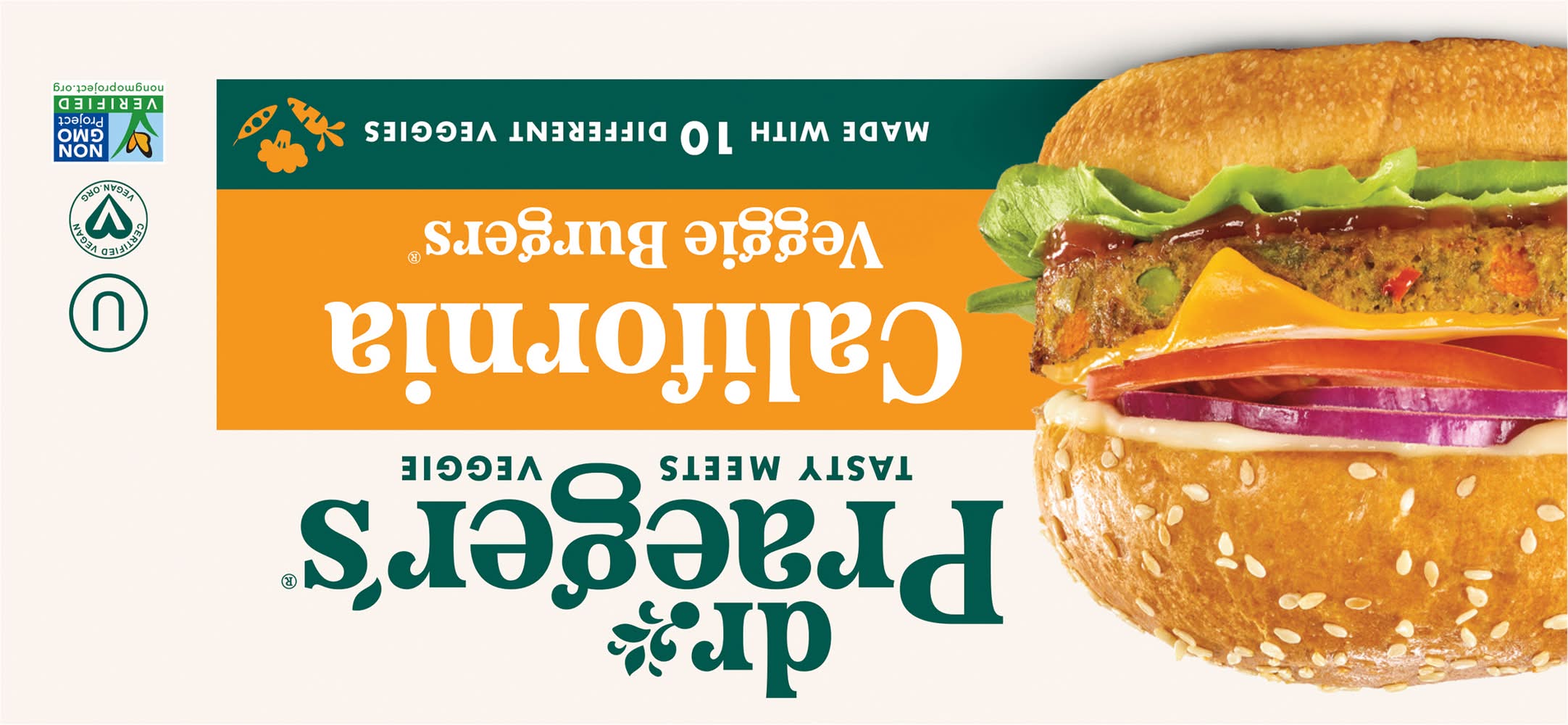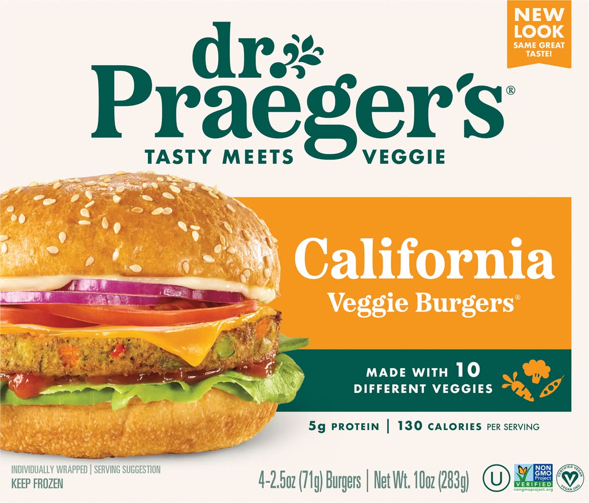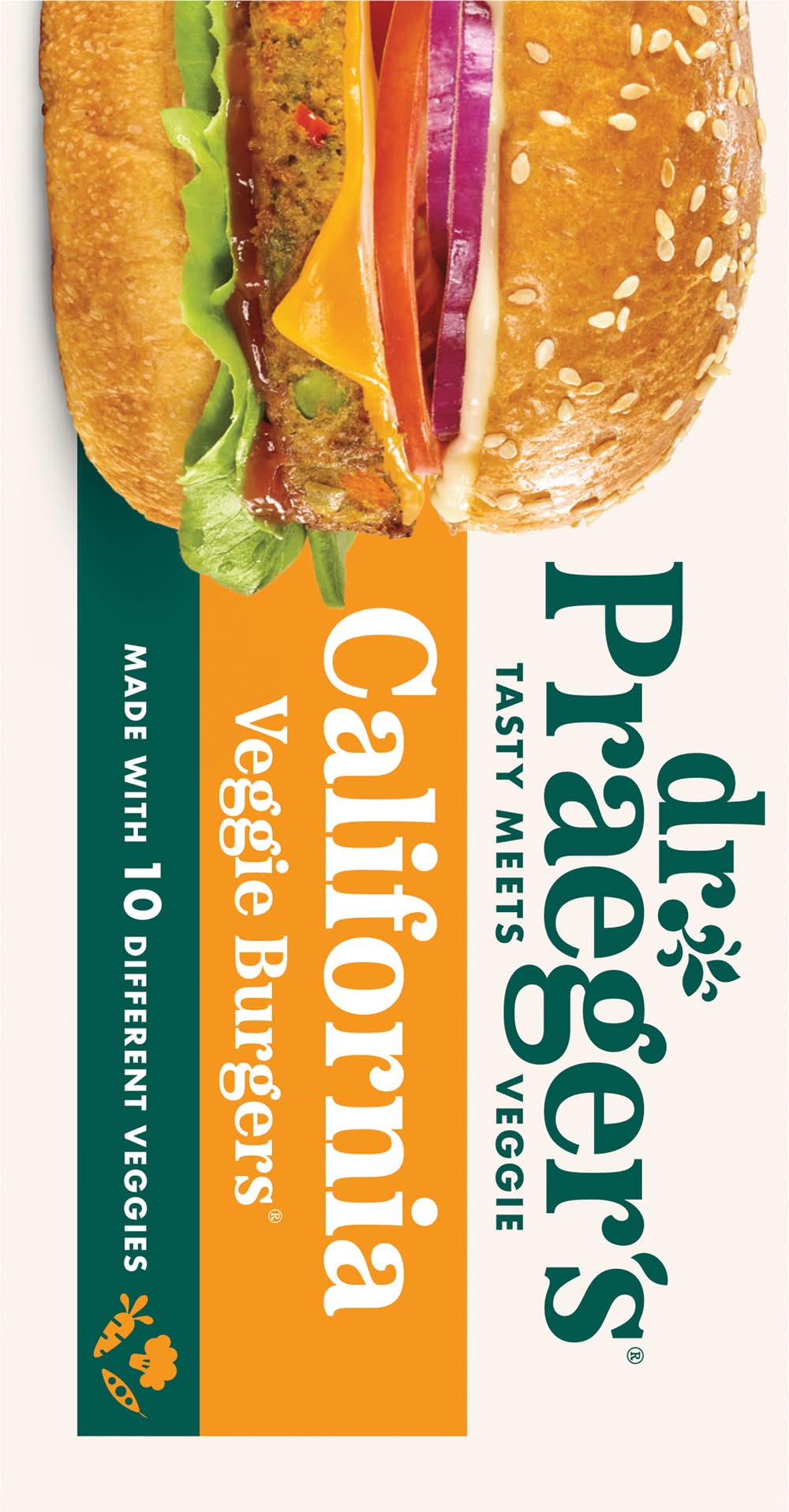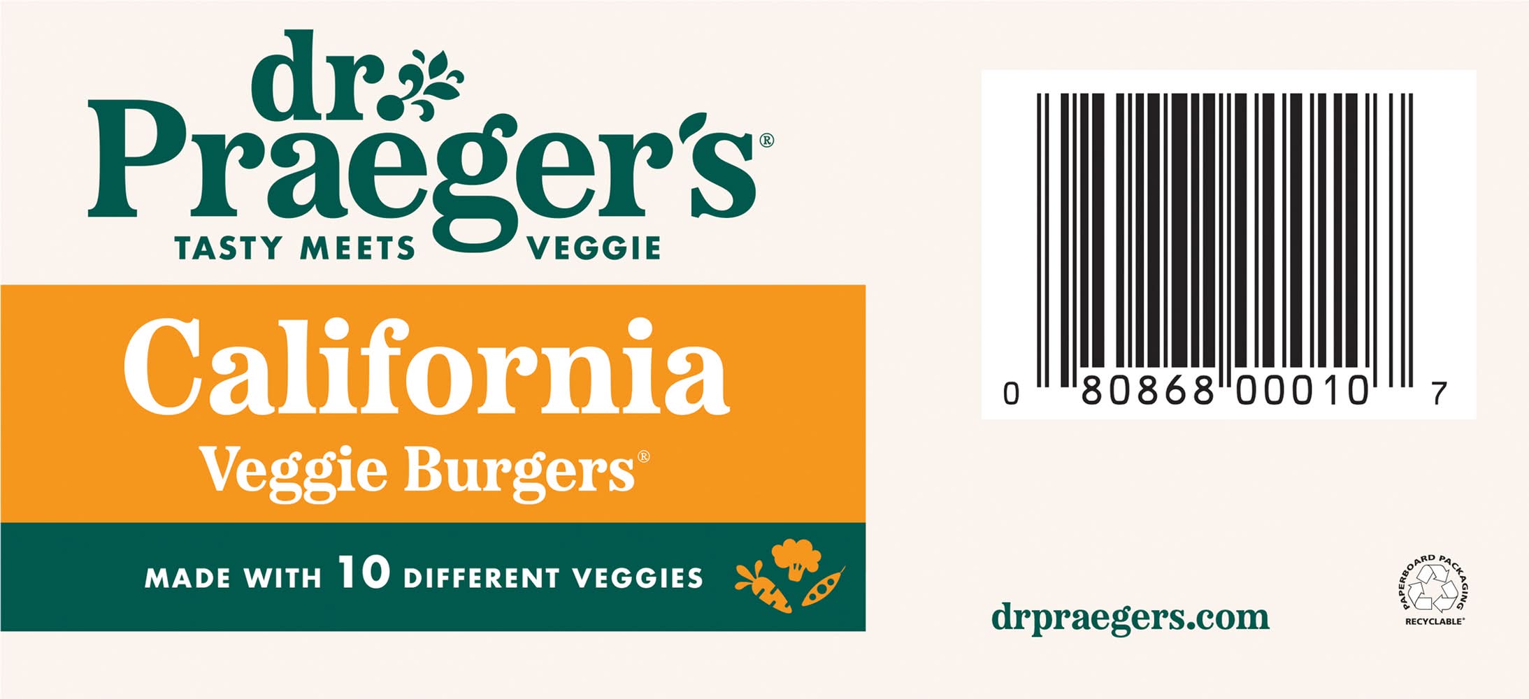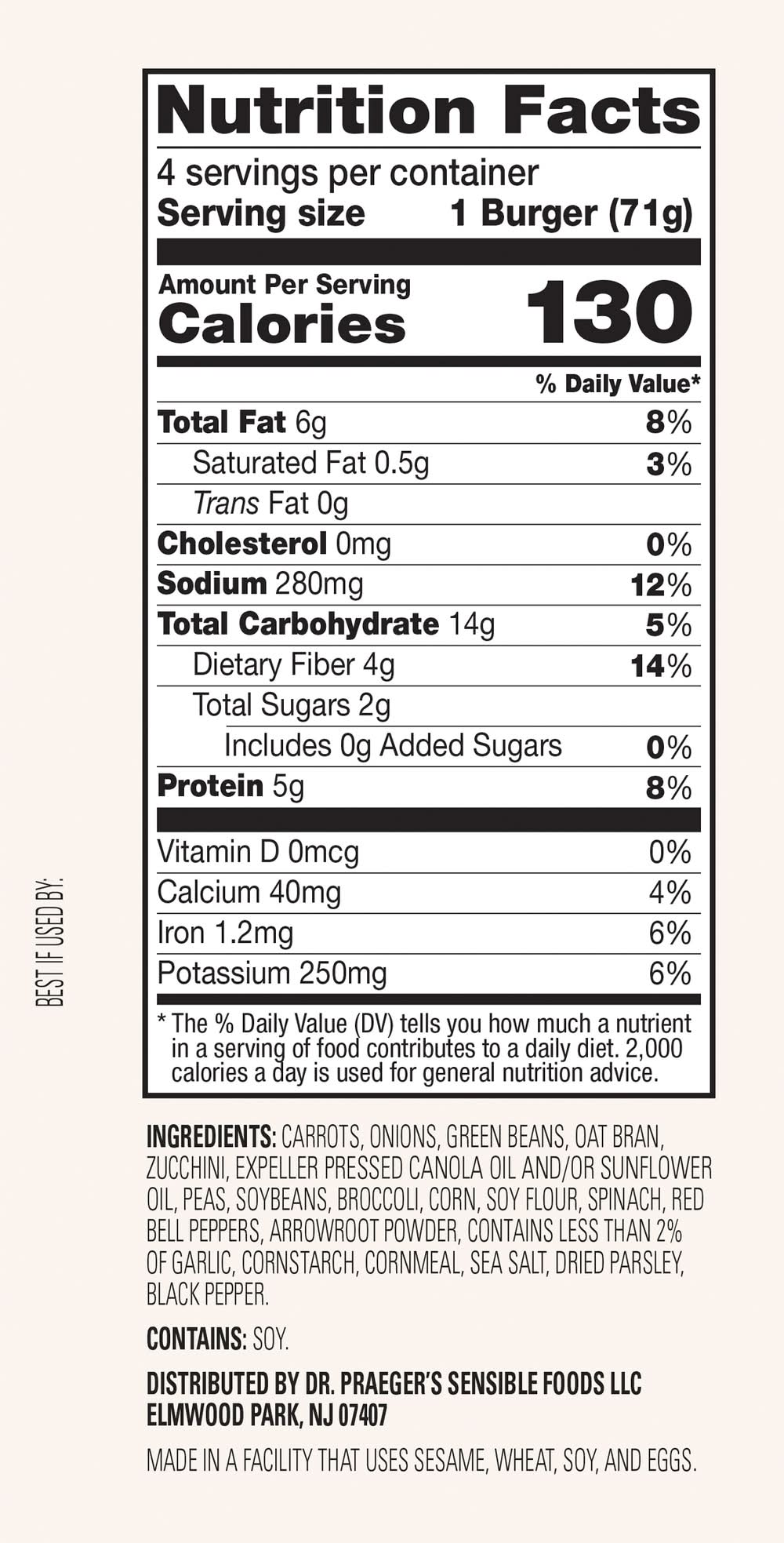 5 g protein. 130 calories per serving. Certified vegan. Vegan.org. Non-GMO Project verified. nongmoproject.org. New look same great taste! Where tasty meets veggie, flavor meets goodness, & easy meets mealtime wins! We turn veggies into utterly delicious food, so you never have to choose between crave-able and veggie forward. Inspire by our heart surgeon founders, Dr. Praeger's has been a trusted source for satisfying, plant-based meals for 30 years and counting. Carrots, zucchini, peas, broccoli, and 6 more veggies join forces in out original and most popular patty. drpraegers.com. • Dr. Praeger's Sensible Foods, Inc., Elmwood Park,NJ,07407 • Packaging: Reusable