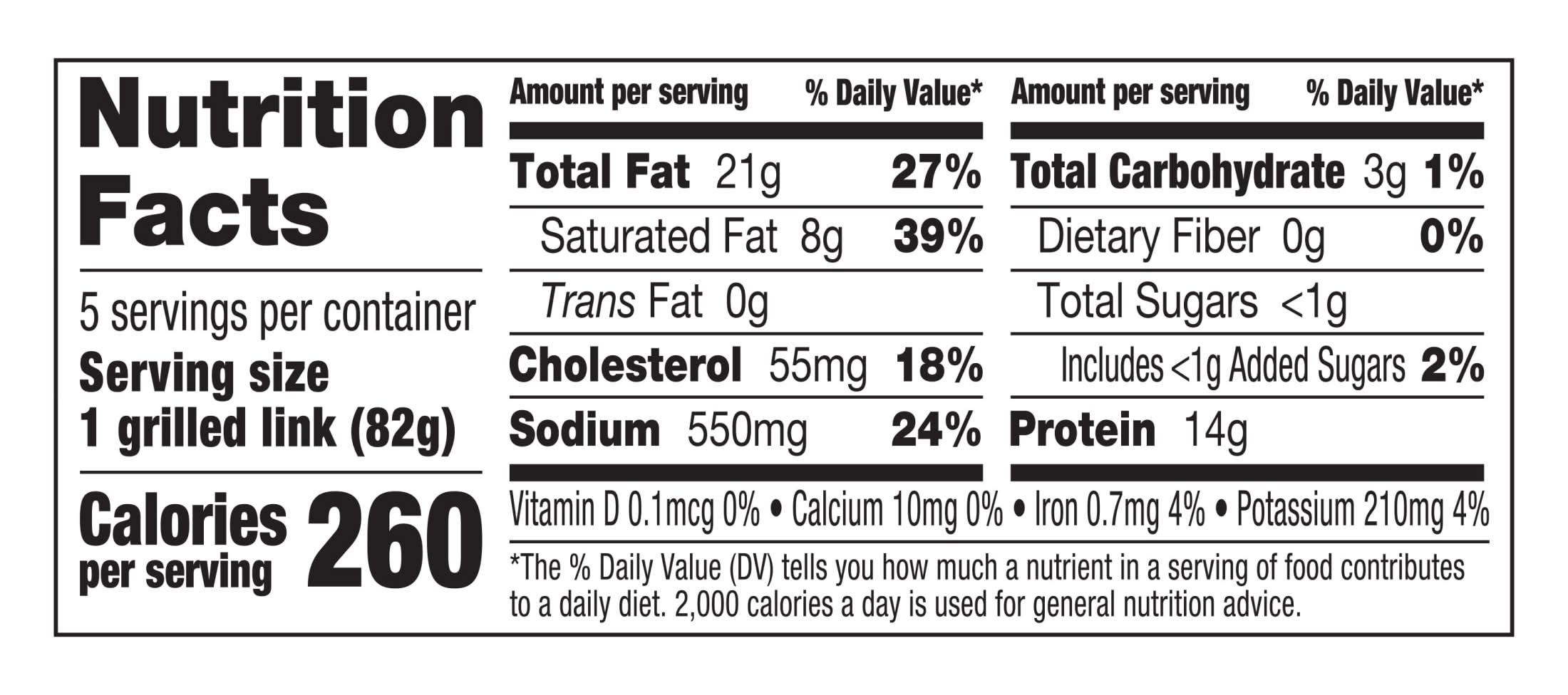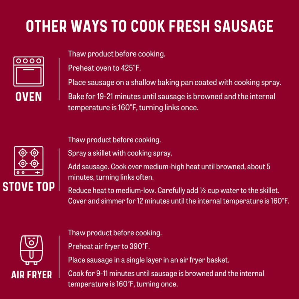 Directions for use: Safe Handling Instructions: This product was prepared from inspected and passed meat and/or poultry. Some food products may contain bacteria that could cause illness if the products is mishandled or cooked improperly. For your protection, follow these safe handling instructions. Keep refrigerated or frozen. Thaw in refrigerator or microwave. Keep raw meat and poultry separate from other foods. Wash working surfaces (including cutting boards), utensils, and hands after touching raw meat or poultry. Cook thoroughly. Keep hot foods hot. Refrigerate leftovers immediately or discard. Grill: Preheat grill to medium-low. Add sausage. Cook, covered, for 15-20 minutes or until sausage is browned and the internal temperature is 160 degrees F, turning links often. Stovetop: Spray a skillet with cooking spray. Add sausage. Cook over medium-high heat until browned, about 5 minutes, turning links often. Reduce heat to medium-low. Carefully add 1/2 cup water to skillet. Cover and simmer for 12 minutes or until the internal temperature is 160 degrees F. Preparation: Thaw product prior to cooking. Previously handled frozen for your protection. Refreeze or keep refrigerated. Storage: Prepare within 3 days of purchase or freeze up to 30 days. Previously handled frozen for your protection. Storage recommendation: Refreeze or keep refrigerated. Storage: Prepare within 3 days of purchase or freeze up to 30 days. Previously handled frozen for your protection.