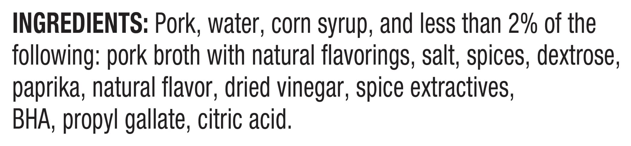 Ingredients: Ingredients: Pork, water, corn syrup, and less than 2% of the following: pork broth with natural flavorings, salt, spices, dextrose, paprika, natural flavor, dried vinegar, spice extractives, BHA, propyl gallate, BHA, citric acid.