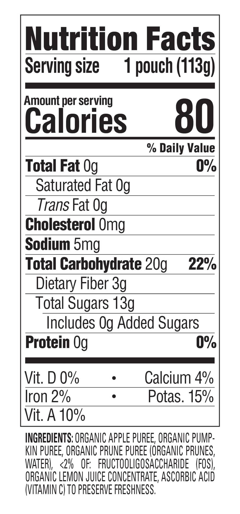 ORGANIC APPLE PUREE, ORGANIC PUMPKIN PUREE, ORGANIC PRUNE PUREE (ORGANIC PRUNES, WATER), 2% OF: FRUCTOOLIGOSACCHARIDE (FOS), ORGANIC LEMON JUICE CONCENTRATE, ASCORBIC ACID (VITAMIN C), TO PRESERVE FRESHNESS.