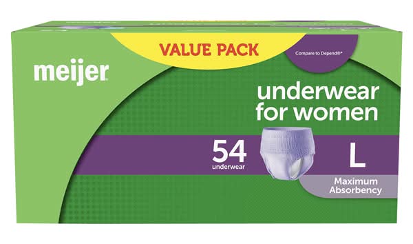 Meijer Underwear for Women, Maximum Absorbency, Large, is protective underwear crafted specifically for women. It features a discreet, form-fitting design, incorporating a Dri Fit Cotton Enhanced system that offers a moisture-wicking surface to help protect sensitive skin. This product is designed to provide maximum protection while being gentle on your skin. Size: Size L