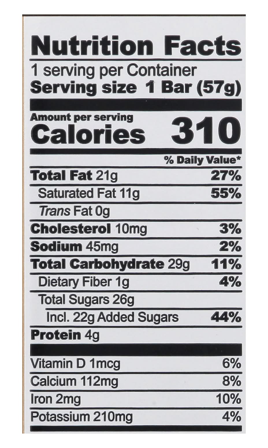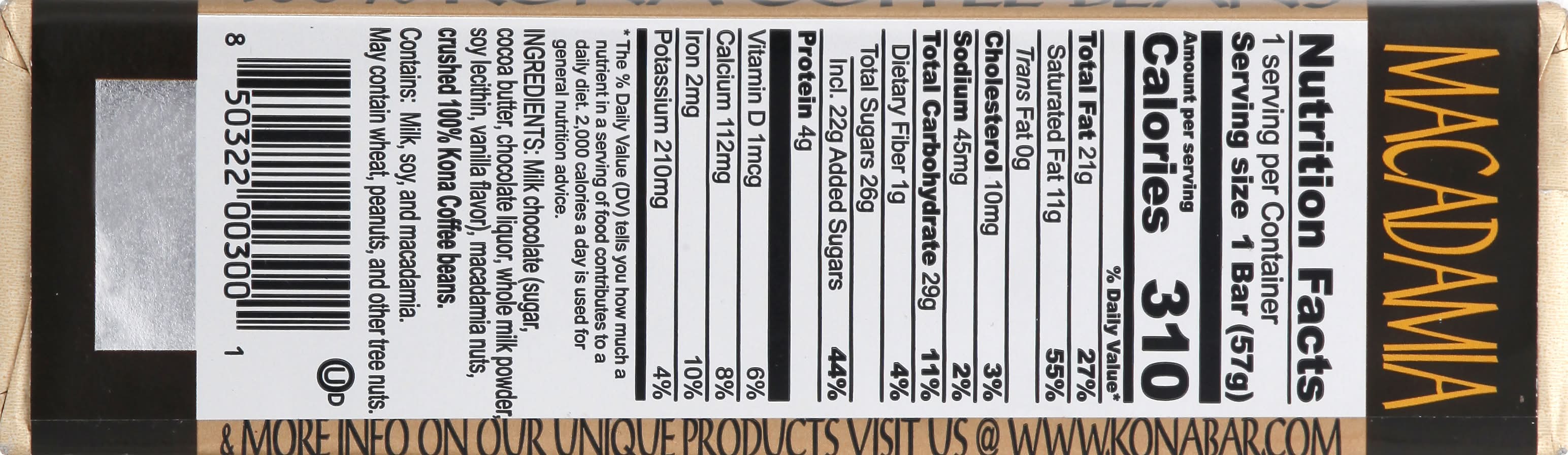 Milk Chocolate (Sugar, Cocoa Butter, Chocolate Liquor, Whole Milk Powder, Soy Lecithin, Vanilla Flavor), Macadamia Nuts, Crushed 100% Kona Coffee Beans Contains: Milk, Soybeans, Tree Nuts, Wheat, Peanuts Additives: None
