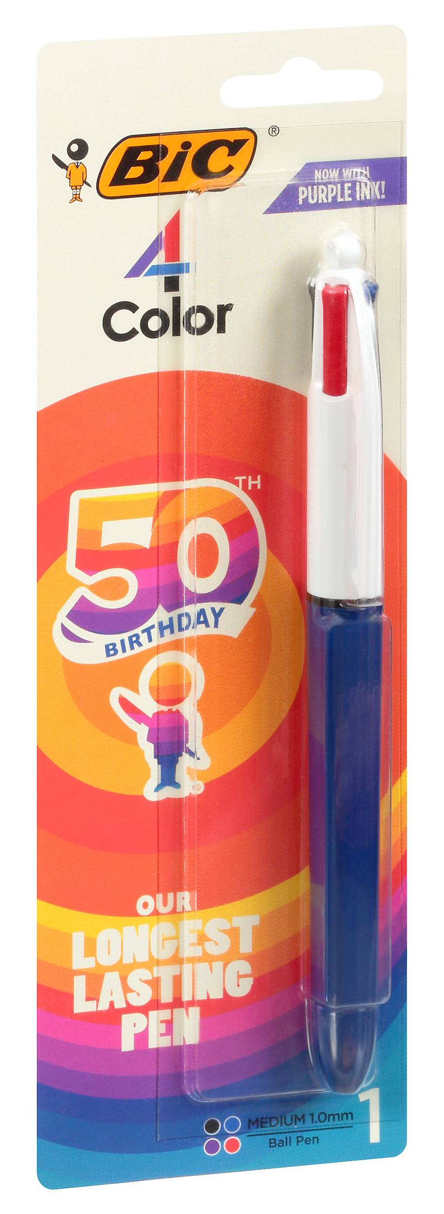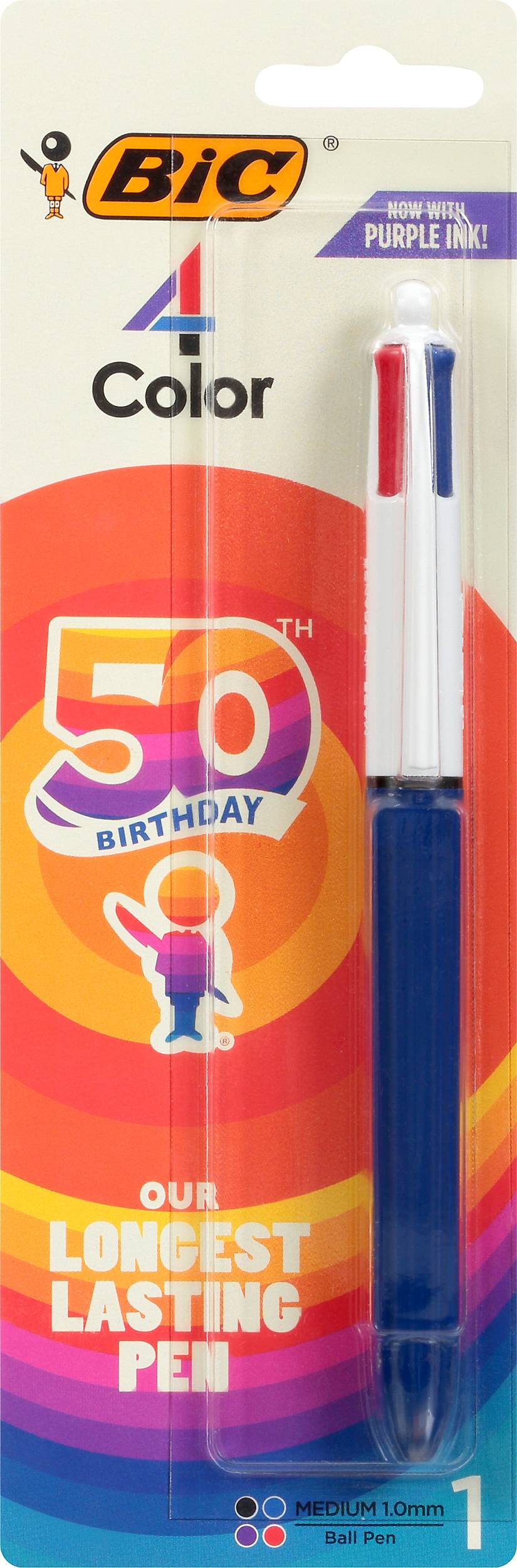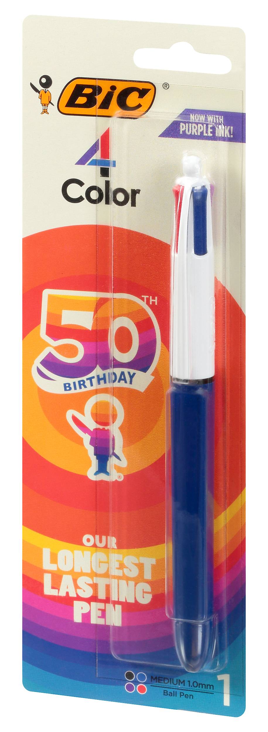 Medium (1.0)mm. 50th Birthday. Our Long lasting pen. Now with purple ink! Four ink colors in one pen! Writes black, blue, red, and now with purple! Fun and colorful expression. Convenient way to organize copy. Long-lasting ink. BIC Performance Policy (US and Canada): If you are not satisfied with the performance of this product, please return it to BIC and we will gladly replace it at no cost to you. www.bic.com. Made in France. Bic USA, Shelton,CT,06484