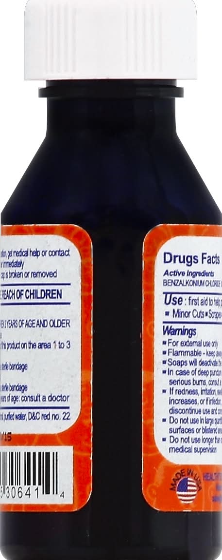 Benzalkonium Chloride 0.13%. Purpose: First Aid Antiseptic Contains: None Additives: Alcohol, Purified Water, D&C Red 22