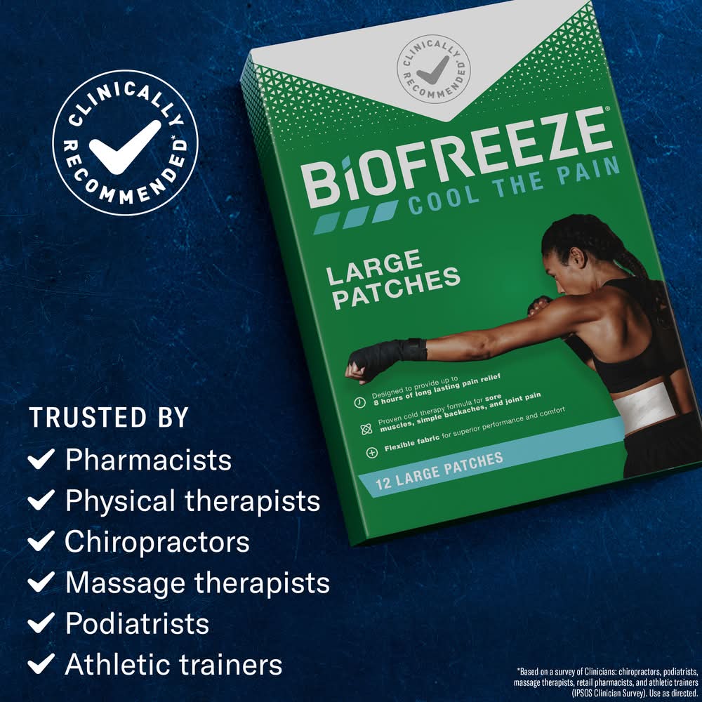 Biofreeze Menthol Pain Relieving Patches with menthol-topical analgesic are designed to provide up to 8 hours Of long-lasting pain relief. Long lasting, cooling menthol formula delivers penetrating pain relief for sore muscles, simple backaches, sore joints, bruises, and arthritis. These mess-free, individually wrapped, large patches use flexible fabric for superior performance and comfort.