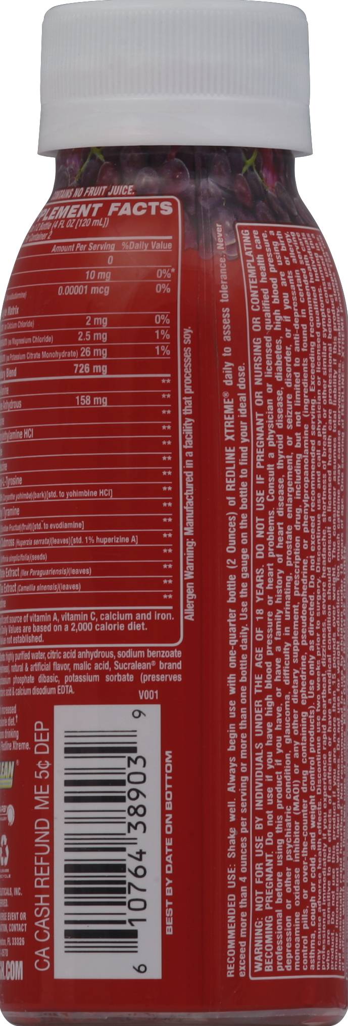 Recommended Use: Shake well. Always begin use with one-quarter bottle (2 ounces) of RedLine Xtreme daily to assess tolerance. Never exceed more than 4 ounces per serving or more than one bottle daily. Use the gauge on the bottle to find your ideal dose.
