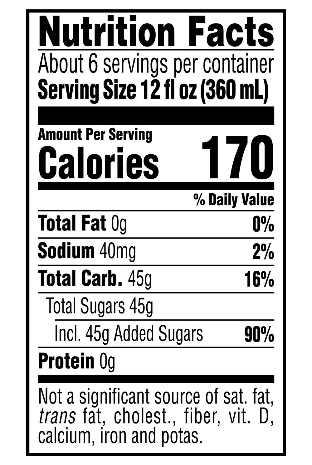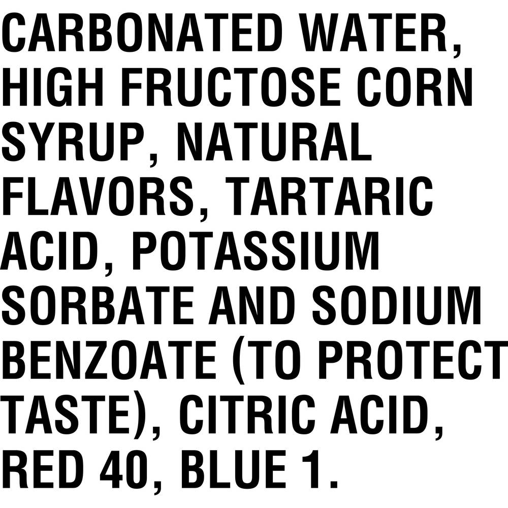 Ingredients: Carbonated Water, High Fructose Corn Syrup, Natural Flavors, Tartaric Acid, Potassium Sorbate and Sodium Benzoate (to Protect Taste), Citric Acid, Red 40, Blue 1 Contains: Corn (Maize)