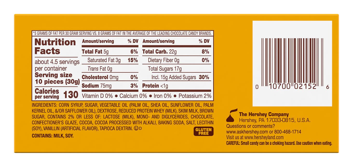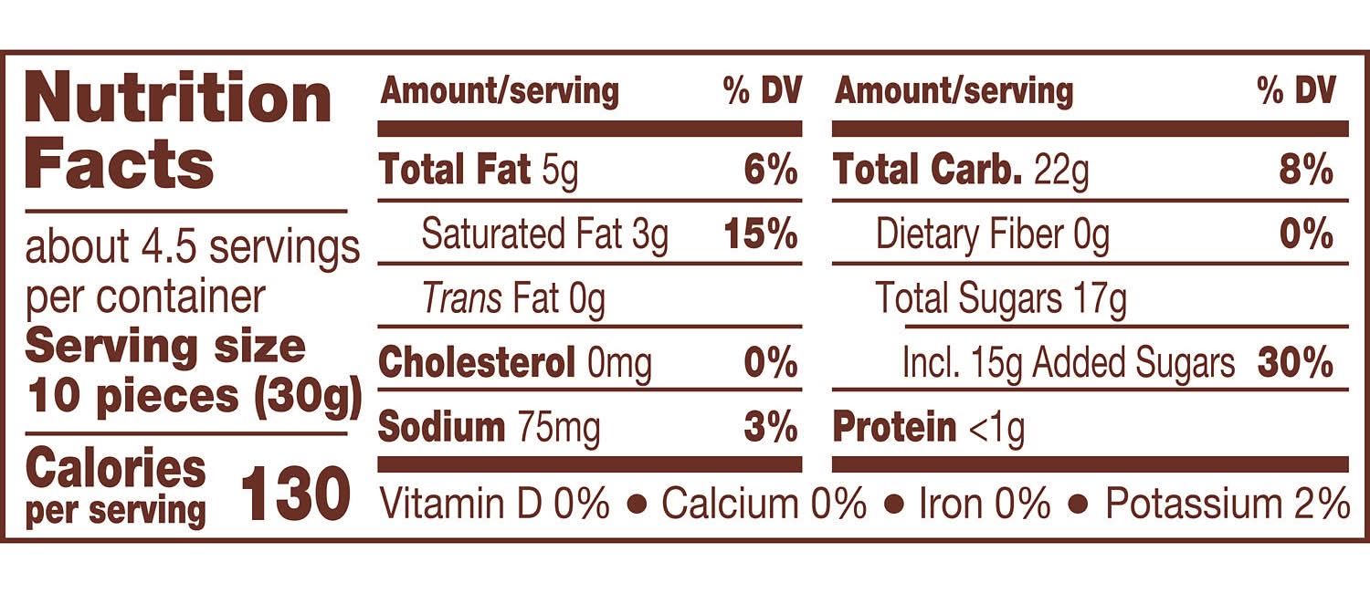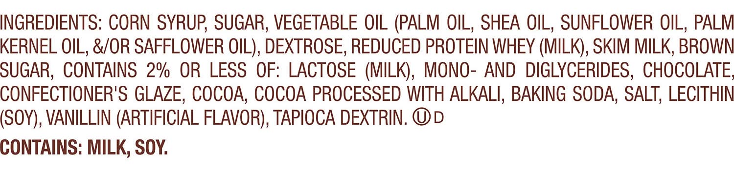 Ingredients: Corn Syrup, Sugar, Vegetable Oil (Palm Oil, Shea Oil, Sunflower Oil, Palm Kernel Oil, &/or Safflower Oil), Dextrose, Reduced Protein Whey (Milk), Skim Milk, Brown Sugar, Contains 2% or less of: Lactose (Milk), Mono- and Diglycerides, Chocolate, Confectioner's Glaze, Cocoa, Cocoa Processed with Alkali, Baking Soda, Salt, Lecithin (Soy), Vanillin (Artificial Flavor), Tapioca Dextrin Contains: Milk, Soybeans, Tree Nuts